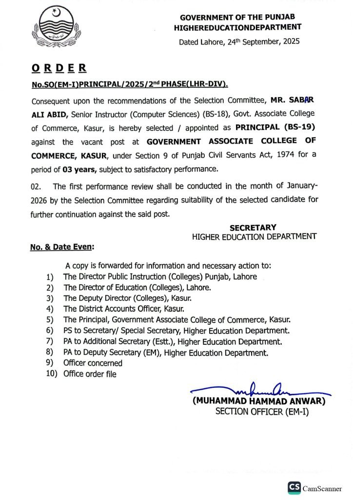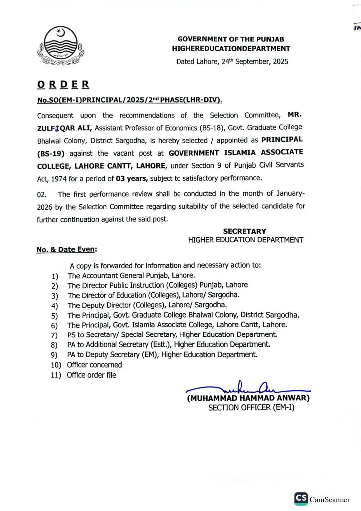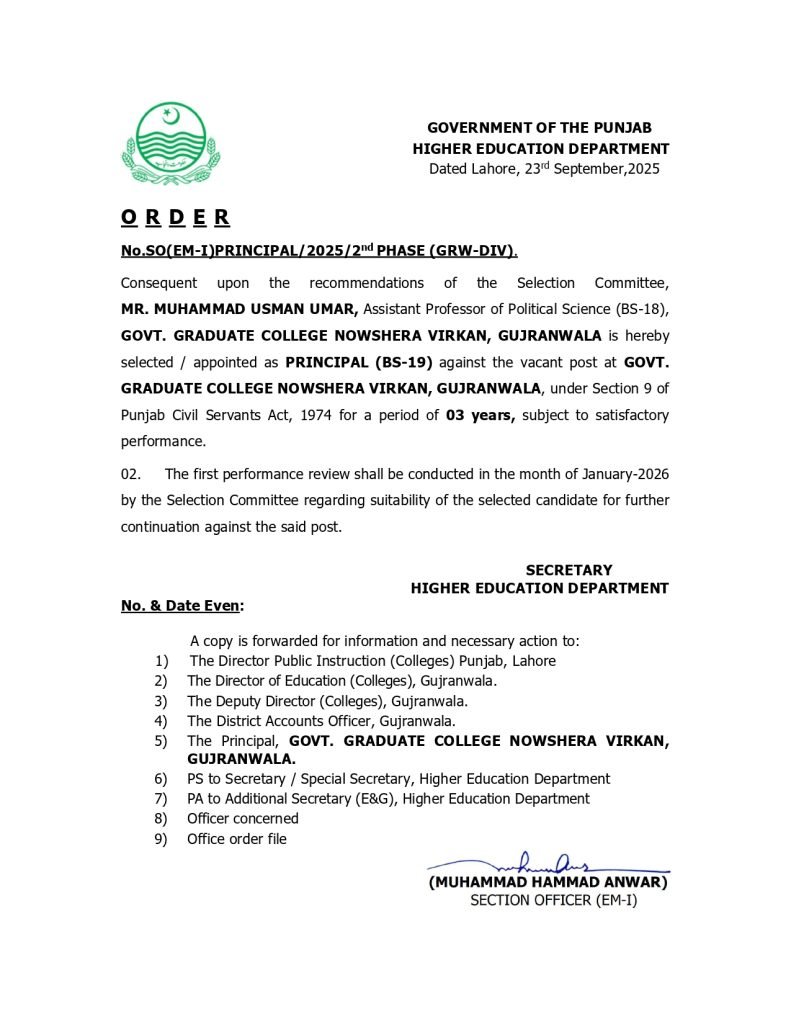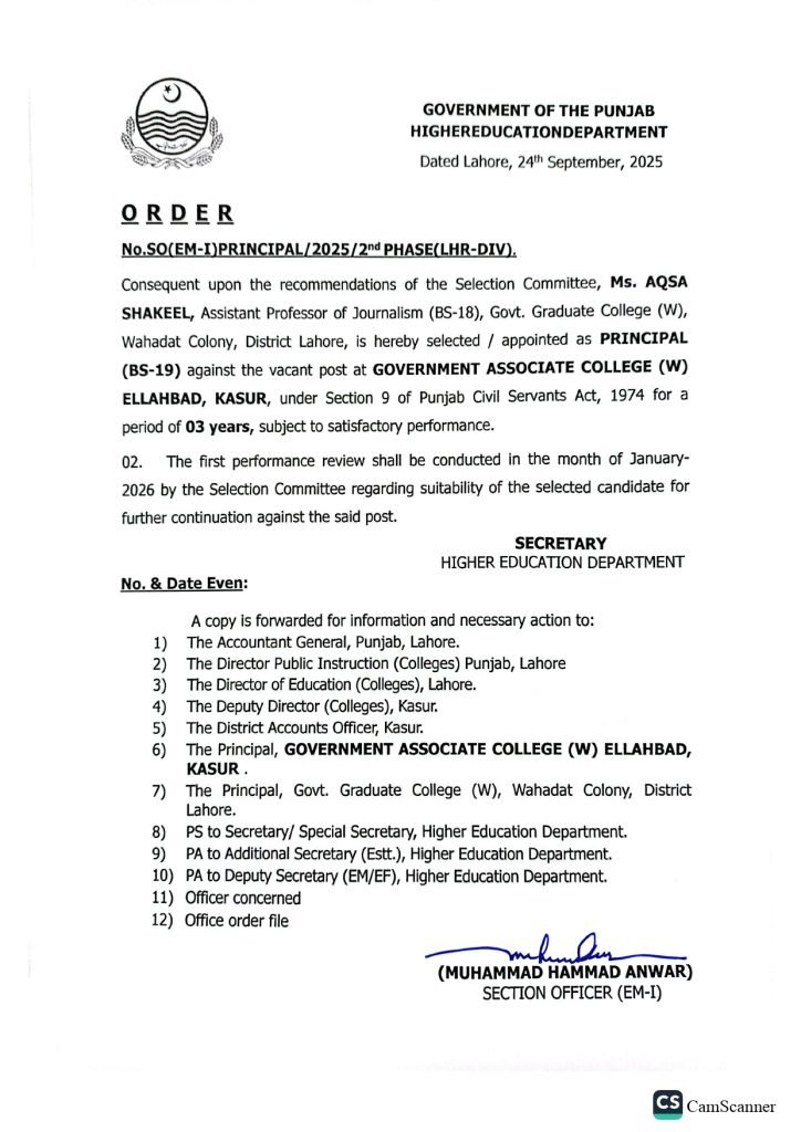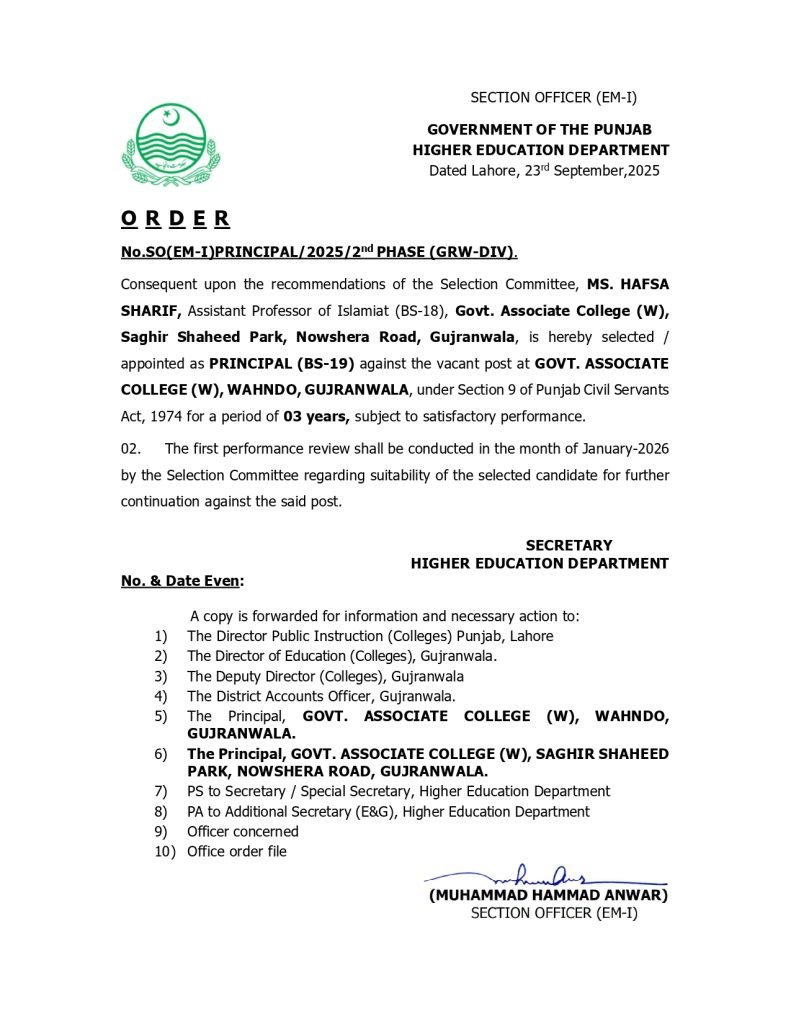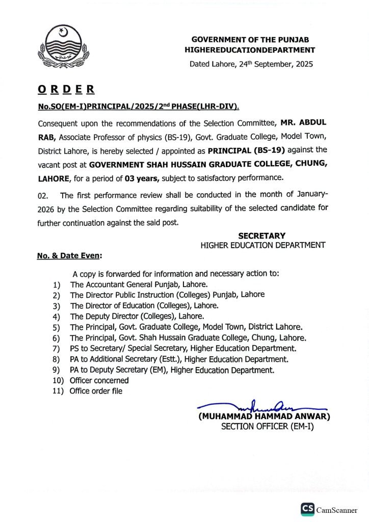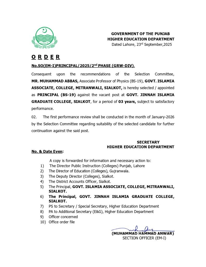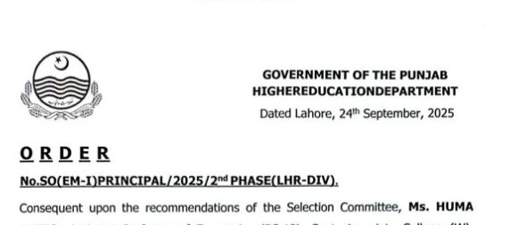 لاہور ( خبر نگار) آج محکمہ ہائر ایجوکیشن نے انٹرویو کے بعد میرٹ بنانے پر سب سے زیادہ سکور والے اکیس امیدوارون کو گوجرانولہ اور لاہور ڈویژنز میں مستقل پرنسپل تعینات کرنے کے آرڈرز جاری کر دئیے دو ماہ سے زائد عرصہ تک جاری رہنے والے عمل کا آخری مرحلہ سلیکشن کمیٹی کے روبرو انٹرویوز تھے وہ مرحلہ بھی 22 اور 23 ستمبر 2025 کو انجام پایا اکیڈمکس اور انٹرویو کے نمبر شامل کر کے کل مارکس پر مبنی میرٹ لسٹ مرتب کی گئی اور ہر سیٹ کے لیے سب سے زیادہ نمبرز حاصل کرنے والے امیدواران کو پرنسپلز تعینات کرنے کے نوٹیفکیشن جاری کر دئیے گئے طریقہ کار کے مطابق سب سے پہلے خالی سیٹوں کو مشتہر کر کے خواہشمند امیدواران سے درخواستیں طلب کی گئیں ہر امیدوار کے تعلیمی اور انتظامی تجربے کے مارکس لگانے کے بعد ایک انتہائی میرٹ لسٹ جاری ہوئی اعتراضات سنے گئے دور کیے گئے اور میرٹ لسٹ کو حتمی شکل دی گئی پھر شارٹ لسٹنگ کی گئی اور آخر میں شارٹ لسٹڈ امیدواران کو انٹرویو کے لیے سلیکشن کمیٹی کے سامنے پیش کیا گیا یوں تمام مراحل کی تکمیل کے بعد احکامات تعیناتی جاری کیے گئے ذیل میں دونوں ڈویژنوں کے جاری کردہ آرڈرز کے عکس پوسٹ کیے گئے ہیں