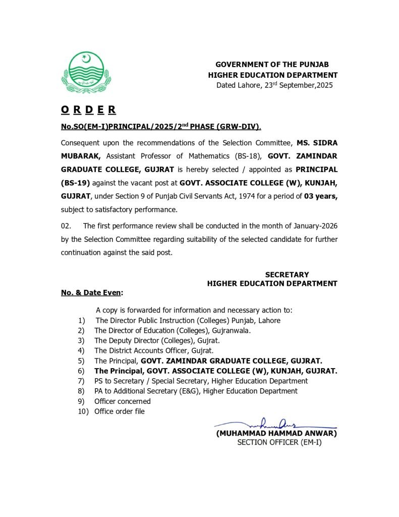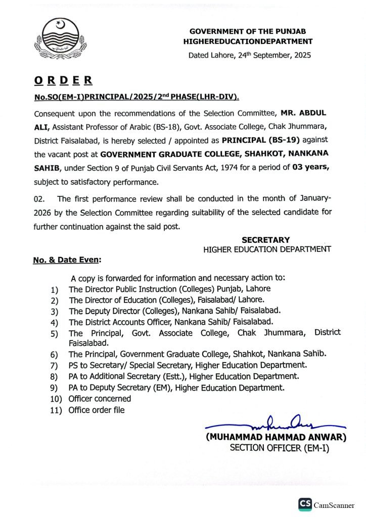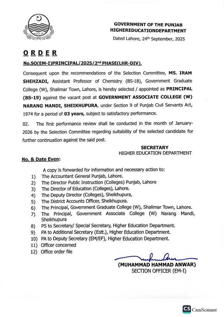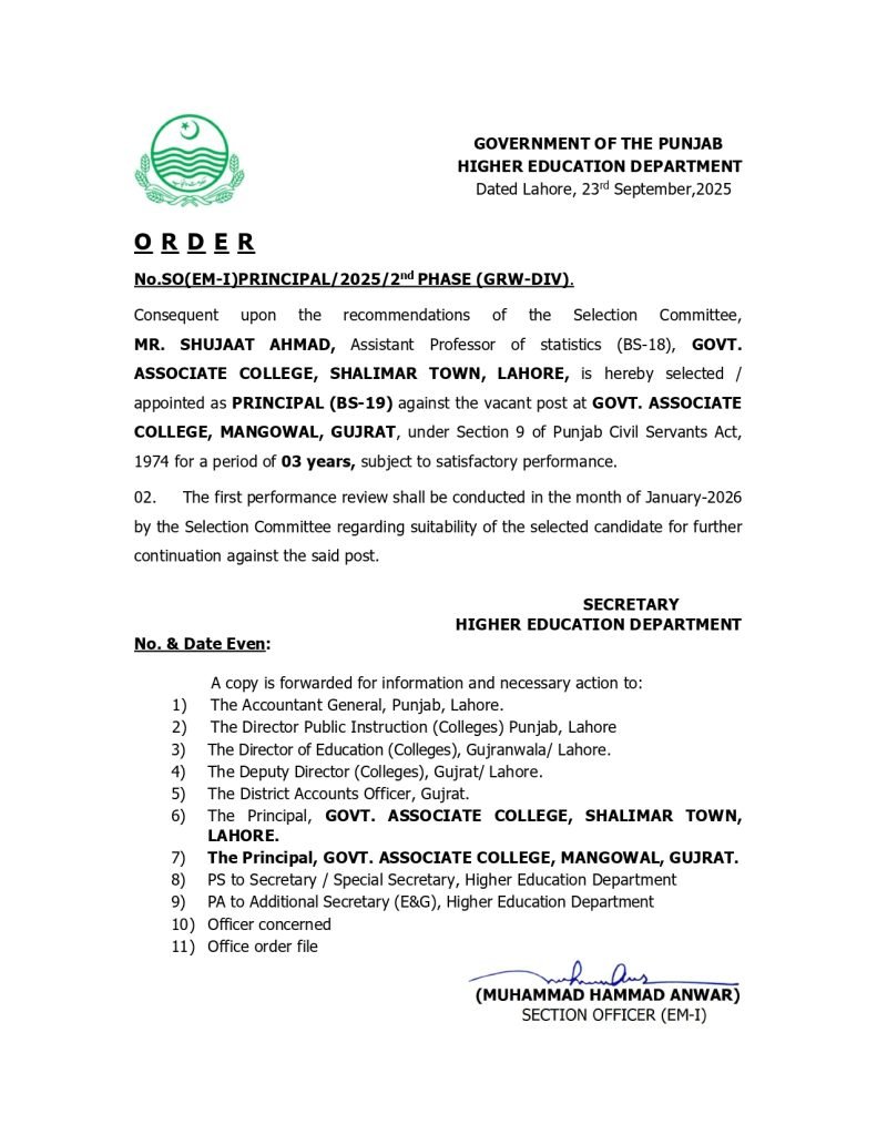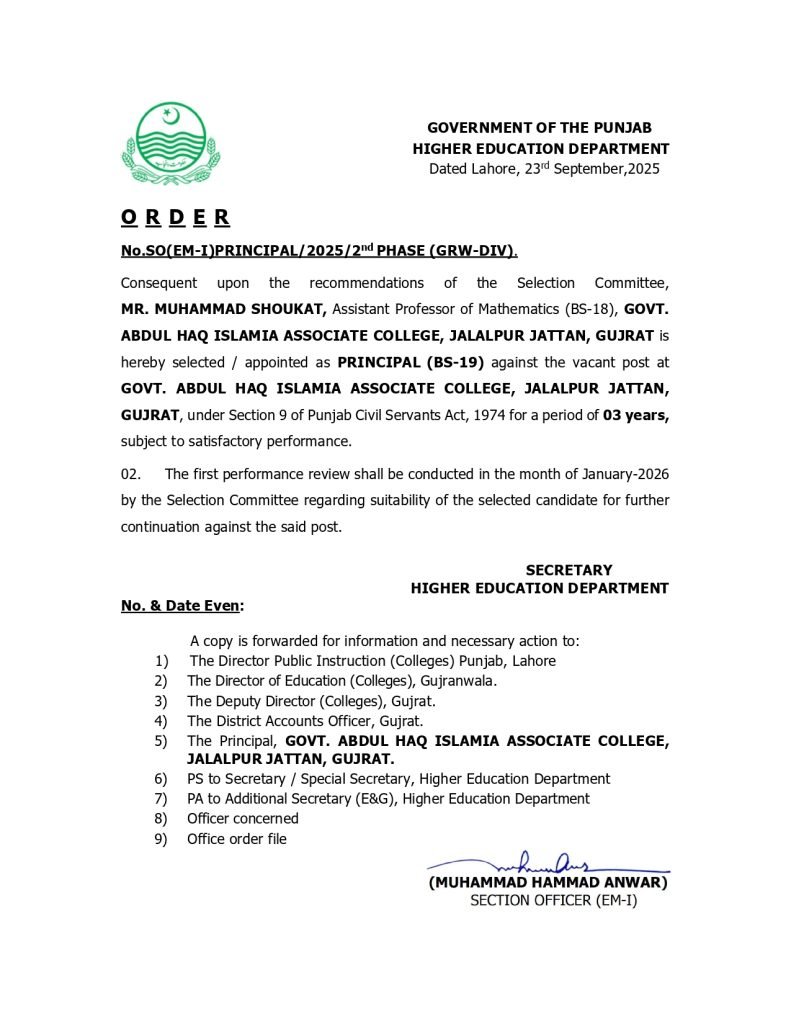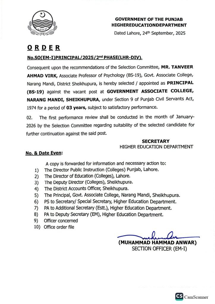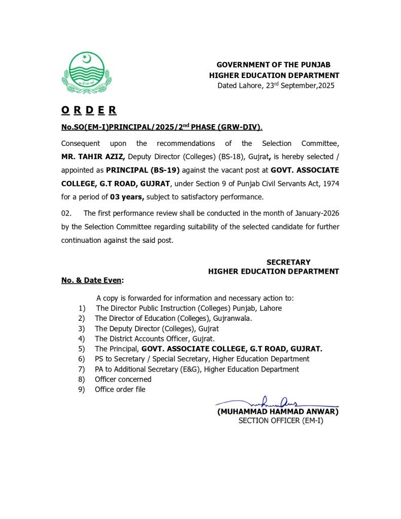 لاہور ( خبر نگار) آج محکمہ ہائر ایجوکیشن نے انٹرویو کے بعد میرٹ بنانے پر سب سے زیادہ سکور والے اکیس امیدوارون کو گوجرانولہ اور لاہور ڈویژنز میں مستقل پرنسپل تعینات کرنے کے آرڈرز جاری کر دئیے دو ماہ سے زائد عرصہ تک جاری رہنے والے عمل کا آخری مرحلہ سلیکشن کمیٹی کے روبرو انٹرویوز تھے وہ مرحلہ بھی 22 اور 23 ستمبر 2025 کو انجام پایا اکیڈمکس اور انٹرویو کے نمبر شامل کر کے کل مارکس پر مبنی میرٹ لسٹ مرتب کی گئی اور ہر سیٹ کے لیے سب سے زیادہ نمبرز حاصل کرنے والے امیدواران کو پرنسپلز تعینات کرنے کے نوٹیفکیشن جاری کر دئیے گئے طریقہ کار کے مطابق سب سے پہلے خالی سیٹوں کو مشتہر کر کے خواہشمند امیدواران سے درخواستیں طلب کی گئیں ہر امیدوار کے تعلیمی اور انتظامی تجربے کے مارکس لگانے کے بعد ایک انتہائی میرٹ لسٹ جاری ہوئی اعتراضات سنے گئے دور کیے گئے اور میرٹ لسٹ کو حتمی شکل دی گئی پھر شارٹ لسٹنگ کی گئی اور آخر میں شارٹ لسٹڈ امیدواران کو انٹرویو کے لیے سلیکشن کمیٹی کے سامنے پیش کیا گیا یوں تمام مراحل کی تکمیل کے بعد احکامات تعیناتی جاری کیے گئے ذیل میں دونوں ڈویژنوں کے جاری کردہ آرڈرز کے عکس پوسٹ کیے گئے ہیں