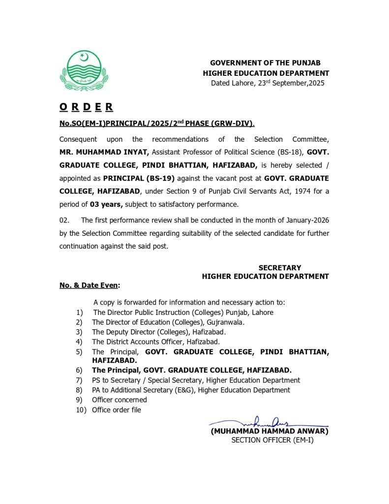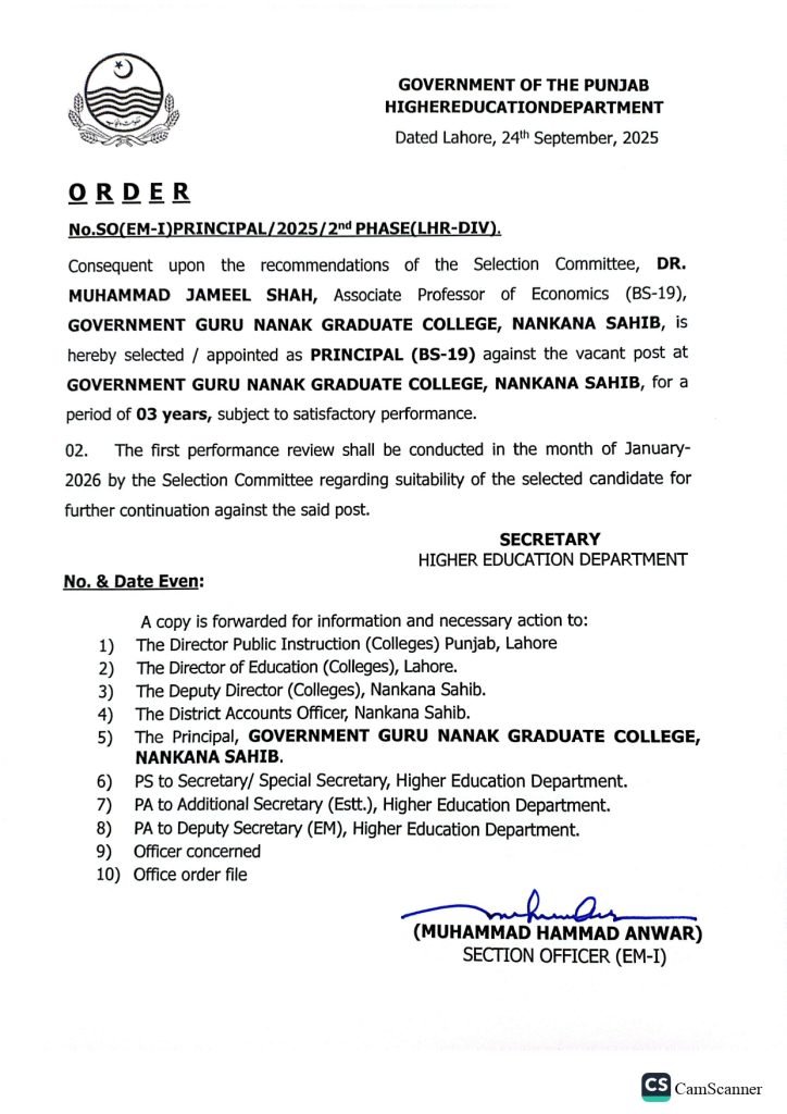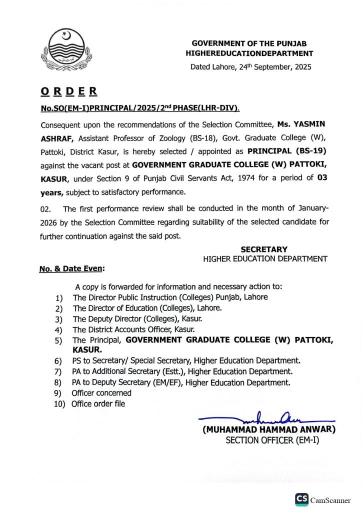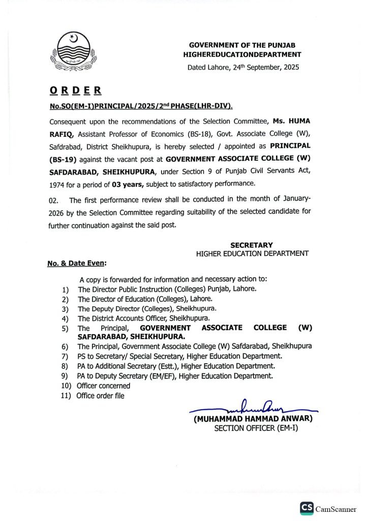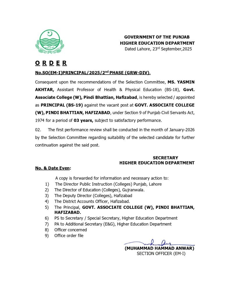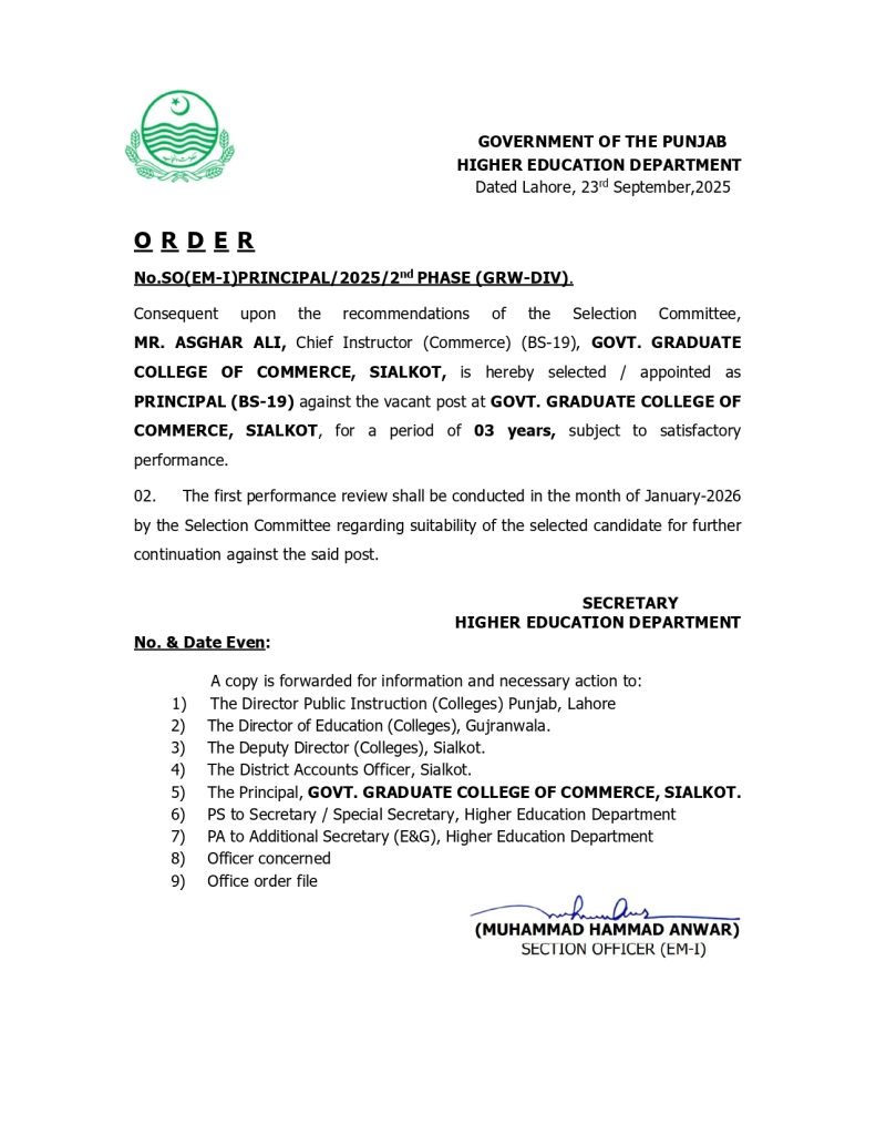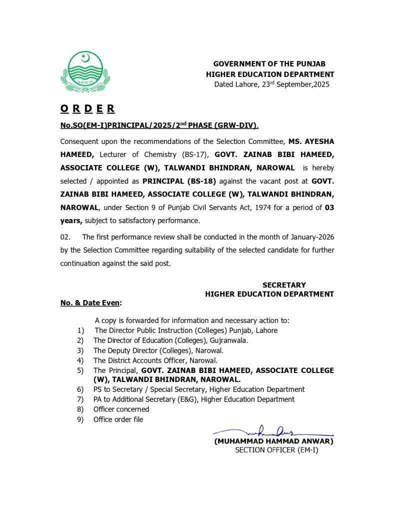 لاہور ( خبر نگار) آج محکمہ ہائر ایجوکیشن نے انٹرویو کے بعد میرٹ بنانے پر سب سے زیادہ سکور والے اکیس امیدوارون کو گوجرانولہ اور لاہور ڈویژنز میں مستقل پرنسپل تعینات کرنے کے آرڈرز جاری کر دئیے دو ماہ سے زائد عرصہ تک جاری رہنے والے عمل کا آخری مرحلہ سلیکشن کمیٹی کے روبرو انٹرویوز تھے وہ مرحلہ بھی 22 اور 23 ستمبر 2025 کو انجام پایا اکیڈمکس اور انٹرویو کے نمبر شامل کر کے کل مارکس پر مبنی میرٹ لسٹ مرتب کی گئی اور ہر سیٹ کے لیے سب سے زیادہ نمبرز حاصل کرنے والے امیدواران کو پرنسپلز تعینات کرنے کے نوٹیفکیشن جاری کر دئیے گئے طریقہ کار کے مطابق سب سے پہلے خالی سیٹوں کو مشتہر کر کے خواہشمند امیدواران سے درخواستیں طلب کی گئیں ہر امیدوار کے تعلیمی اور انتظامی تجربے کے مارکس لگانے کے بعد ایک انتہائی میرٹ لسٹ جاری ہوئی اعتراضات سنے گئے دور کیے گئے اور میرٹ لسٹ کو حتمی شکل دی گئی پھر شارٹ لسٹنگ کی گئی اور آخر میں شارٹ لسٹڈ امیدواران کو انٹرویو کے لیے سلیکشن کمیٹی کے سامنے پیش کیا گیا یوں تمام مراحل کی تکمیل کے بعد احکامات تعیناتی جاری کیے گئے ذیل میں دونوں ڈویژنوں کے جاری کردہ آرڈرز کے عکس پوسٹ کیے گئے ہیں