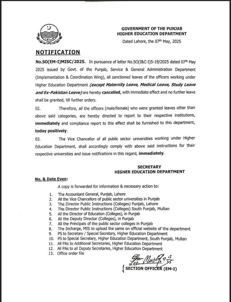 واپس بلا کر اپنے اداروں میں جوائن کرنے کا حکم آئندہ بھی ایسی چھٹیاں نہیں دی جائیں گی