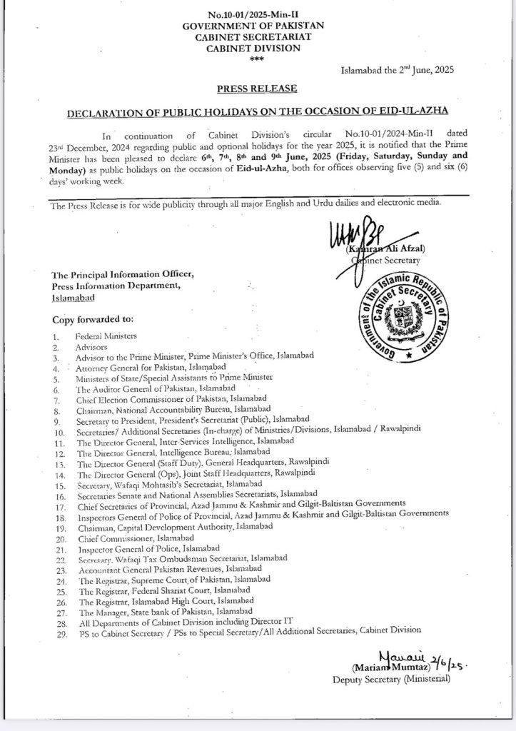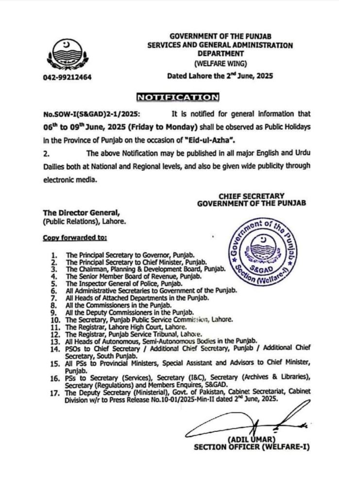 لاہور(نامہ نگار ) عید الاضحی منانے کے لیے وزیر اعلم پاکستان اور کابینہ کی منظوری کے بعد کیبنٹ ڈویژن نے میڈیا کے نام ایک پریس ریلیز جاری کیا جس کے مطابق اس مذہبی تہوار کو منانے کے لیے ملک بھربھی میں چھ جون بروز جمعہ سے سوموار نو جون تک چار ایام کے لیے عام تعطیل کا اعلان کیا ہے تمام سرکاری نیم سرکاری اور نجی ادارے اس دوران بند رہیں گے اس اعلان کی تقلید میں پنجاب کے محکمہ سروسز اینڈ جنرل ایڈمنسٹریشن ڈیپارٹمنٹ نے چیف سیکرٹری کے ایما پر اسی مضمون پر مبنی نوٹیفکیشن جاری کر دیا ہے چند روز قبل من چلوں نے پانچ چھٹوں کا نوٹیفکیشن بنا کر سوشل میڈیا پر مشتہر کیا تھا جو فیک ہے