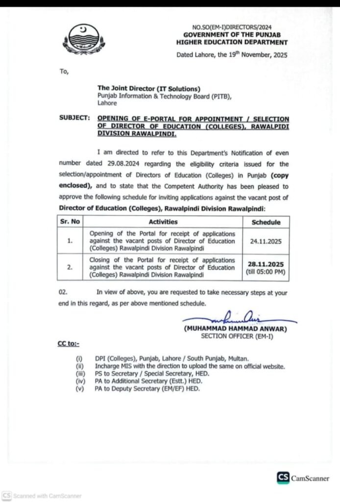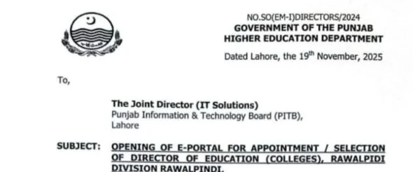راولپنڈی( نامہ نگار) ہائر ایجوکیشن ڈیپارٹمنٹ پنجاب کی جانب سے جوائنٹ ڈائریکٹر آئی ٹی سلوشن پنجاب انفارمیشن اینڈ ٹیکنالوجی بورڈ لاہور کو مشتہر کرنے لیے کہا گیا ہے کہ ڈویژنل ڈائریکٹر ہائر ایجوکیشن ڈیپارٹمنٹ راولپنڈی کی خالی آسامی پر بھرتی کے لیے اہل امیدواران سے درخواستیں مطلوب ہیں طے شدہ شیڈول کے مطابق درخواستیں وصول کرنے کے لیے ای پورٹل 24 نومبر 2025بروز سوموار سے لیکر 28 نومبر 2025 بروز بمعہ تک پورٹل کھلا رہے گا طے شدہ طریقہ کار کے مطابق محکمہ موصول ہونے والی درخواستوں کے امیدوار کا میرٹ بنانے کے لیے مشتہر شدہ طریقہ کار کے مطابق بنائے گا اگر امیدواران کی تعداد زیادہ ہوئی تو شارٹ لسٹنگ کی جائے گی