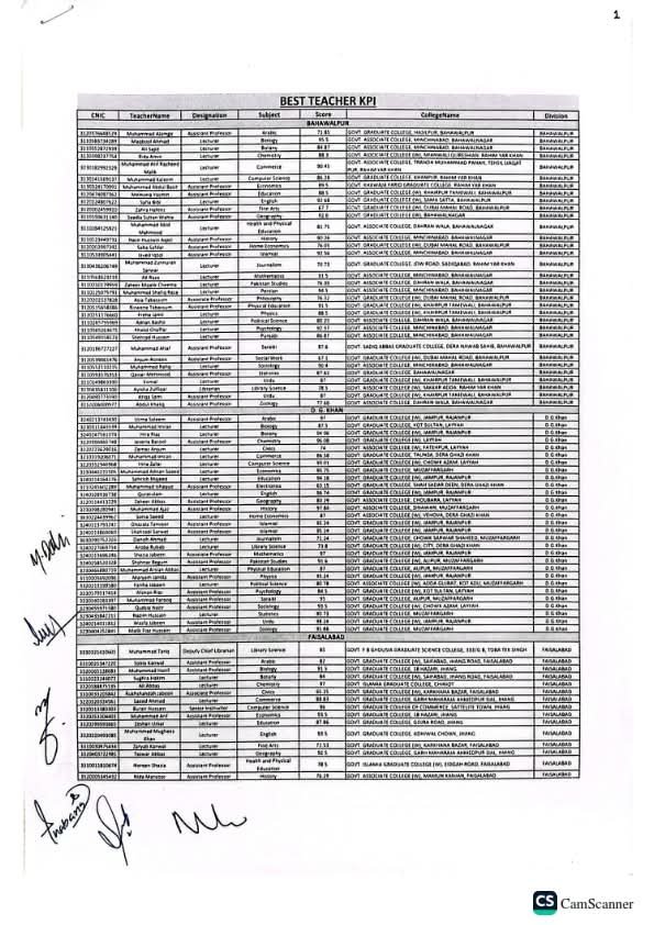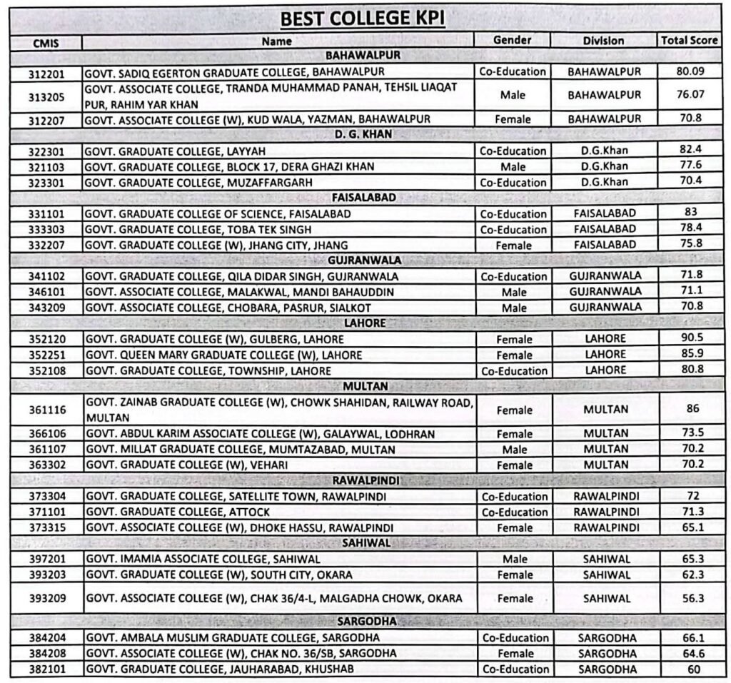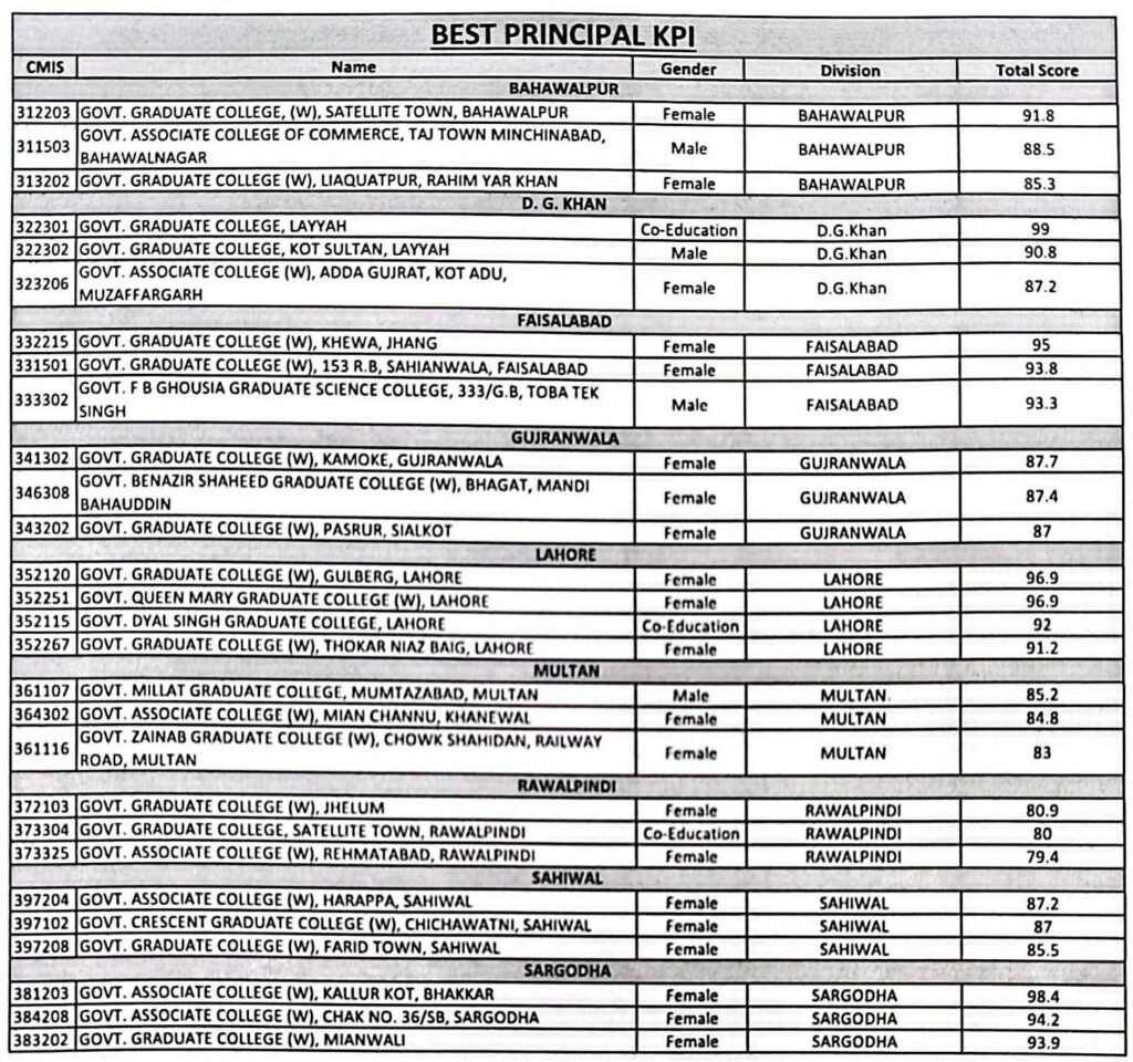 ہائر ایجوکیشن ڈیپارٹمنٹ کی جانب سے ڈی پی آئی کالجز پنجاب نے اپنے فیس بک پیج پر بیسٹ کالجز، بیسٹ پرنسپلز اور بیسٹ ٹیچرز کی ابتدائی لسٹیں جاری کردی ہیں۔ اگر کسی کو ان پر اعتراض ہے تو اپنے تحفظات اگلتے ہفتے پیر تا بدھ جمع کروا سکتا ہے۔ اعتراضات ایڈیشنل سیکرٹری اسٹیبلشمنٹ وصول کریں گی۔ ان پرنظر ثانی کی ذمہ داری سپیشل سیکرٹری کی ہو گی۔ تحفظات کی درخواست کے ساتھ متعلقہ ڈاکومنٹس کا لف کرنا لازمی ہوگا۔ نظرثانی کے بعد حق دار ٹھہرائے جانے والوں کو انعامات دئیے جائیں گے۔