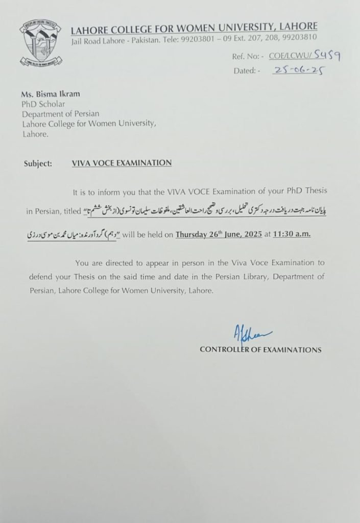 لاہور (خبر نگار )گورنمنٹ ایسوسی ایٹ کالج برائے کوٹ خواجہ سعید لاہور کی شعبہ فارسی کی اسسٹنٹ پروفیسر بسمہ اکرام نے اپنے پی ایچ ڈی کے مقالے کا کامیابی سے دفاع کر کے ڈاکٹریٹ کی ڈگری حاصل کر لی میڈم بسمہ اکرام نے یہ تحقیقی مقالہ لاہور کالج برائے خواتین لاہور کی شعبہ فارسی کی چیئرپرسن ڈاکٹر فلیحہ زہرا کاظمی کی زیر نگرانی مکمل کیا ان کی سپر وائزر محترمہ ڈاکٹر سیدہ فلیحہ زہرا کاظمی کی شخصیت کسی تعارف کی محتاج نہیں وہ فارسی ادب کی ایک بلند پایہ سکالر ہیں اور ہوم اکنامکس یونیورسٹی میں طور وائس چانسلر خدمات سر انجام دے چکی ہیں ان کے مقالے کا عنوان تھا ،،پایان نامہ جہت دریافت درجہ دکتری تحلیل ،پردسی و تصحیح راحت العاشقین ، ملفوظات سلیمان تونسوی (از بحش ششم تا دہم ) گرد اور ندہ: میاں محمد بن موسیٰ درزی. ..کل مورخہ 26 جون 2025 کو لاہور کالج برائے خواتین یونیورسٹی کے شعبہ فارسی کے زیر اہتمام ایک تقریب کا انعقاد کیا گیا جس میں محترمہ بسمہ اکرام نے اپنے مقالے پر بات کی اور ممتحنیں کے سوالات کے جواب دئیے کامیاب دفاع کے بعد انہیں ڈاکٹر یٹ کا حقدار قرار دے دیا گیا اتحاد اساتذہ پاکستان نے انہیں ڈاکٹریٹ کی ڈگری کے حصول پر مبارکباد پیش کی ہے