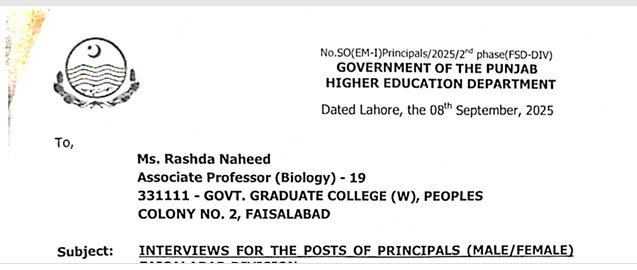لاہور ( نامہ نگار) فیصل آباد اور گوجرانولہ میں پرنسپلز کی خالی آسامیوں پر 51 امیدواران کے انٹرویوز کے شیڈول کا اعلان کر دیا گیا ہے عرصہ ہوا ان آسامیوں پر امیدواران کی درخواستیں طلب کی گئیں کل امیدواران میں شارٹ لسٹنگ کے بعد فیصل آباد ڈویژن سے 32 اُمیدواروں کو شارٹ لسٹ کیا گیا جبکہ گوجرانولہ سے 19 امیدواران کو شارٹ لسٹ کیا گیا ان امیدواران کو دس ستمبر 2025 کو ہائر ایجوکیشن ڈیپارٹمنٹ کے اولڈ آفیس اف ڈائریکٹوریٹ آف پبلک انسٹرکشن پنجاب نئی انارکلی لاہور کے کمیٹی روم میں انٹرویوز کے لیے طلب کیا گیا ہے دونوں ڈویژنز کے امیدواران کے انٹرویوز ایک ہی دن ہونگے فیصل آباد ڈویژن والوں کو صبح دس بجے جبکہ گوجرانولہ ڈویژن والوں کودوپہر بارہ بجے کا وقت دیا گیا ہے