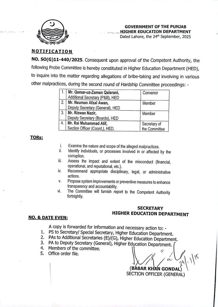 قمر الزماں قیصرانی ایڈیشنل سیکرٹری کنوینئر ،۔نعمان افضل اعوان ڈپثی سیکرٹری (جنرل )ایچ ای ڈی ممبر،رضوان نذیر ڈپٹی سیکرٹری ( بورڈز) ایچ ای ڈی ممبر اور رائے محمد عارف ڈپٹی سیکرٹری ( کوارڈینیشن ) ایچ ای ڈی سیکرٹری کمیٹی ہونگے
