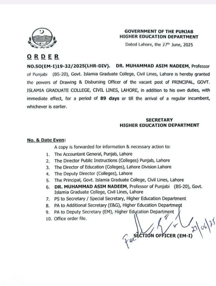 لاہور (نامہ نگار ) محکمہ ہائر ایجوکیشن ڈیپارٹمنٹ نے گورنمنٹ اسلامیہ گریجویٹ کالج سول لائنز لاہور کے پرنسپل کی خالی سیٹ پر ڈاکٹر محمد عاصم ندیم کو عارضی پرنسپل کا چارج سونپ دیا ہے یہ سیٹ مستقل پرنسپل کے 18جون 2025 کو ایل پی آر پر چلے جانے کے باعث خالی ہوئی تھی ڈاکٹر محمد عاصم ندیم پنجابی ادب کے ڈاکٹریٹ ہیں اور اسی کالج میں بطور وائس پرنسپل کام کر رہے ہیں انہوں نے عہدے کا چارج سنبھال کر اپنے کام کا آغاز کر دیا ہے