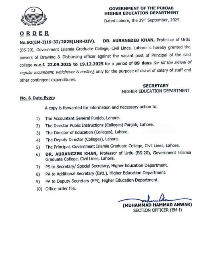 لاہور ( خبر نگار ) ڈاکٹر اورنگزیب نیازی کو گورنمنٹ اسلامیہ گریجویٹ کالج سول لائنز لاہور کے پرنسپل کا عارضی جارج پروفیسر ڈاکٹر اورنگ زیب نیازی کے سپرد کر دیا گیا ہے ہائر ایجوکیشن ڈیپارٹمنٹ سے کل 29 ستمبر 2025 کو جاری ہونے وا لے آرڈرز کے مطابق یہ چارج انہیں نواسی روز کے لیے سونپا گیا ہے پہلے یہ چارچ پنجابی ادب کے پروفیسر ڈاکٹر عاصم کے سپرد کیا گیا تھا بعد ازاں یہ نشان دہی کی گئی کہ سنیارٹی میں ڈاکٹر اورنگ زیب ان سے سینئر ہیں تو اس مرتبہ چارج انہیں سونپ دیا گیا ہے پروفیسر ڈاکٹر اورنگ زیب نیازی اردو ادب کے استاد ہیں انہوں نے اپنا مقالہ ،،پاکستان میں اردو تنقید ،، کے موضوع پر لکھ کر پنجاب یونیورسٹی سے ڈاکٹریٹ کی ڈگری حاصل کی اردو تنقید میں انہیں ایک ممتاز مقام حاصل ہے لگ بھگ ایک درجن کتب کے مصنف ہیں اتحاد اساتذہ پاکستان نے انہیں عہدے کا چارج سنبھالنے پر مبارکباد پیش کی ہے