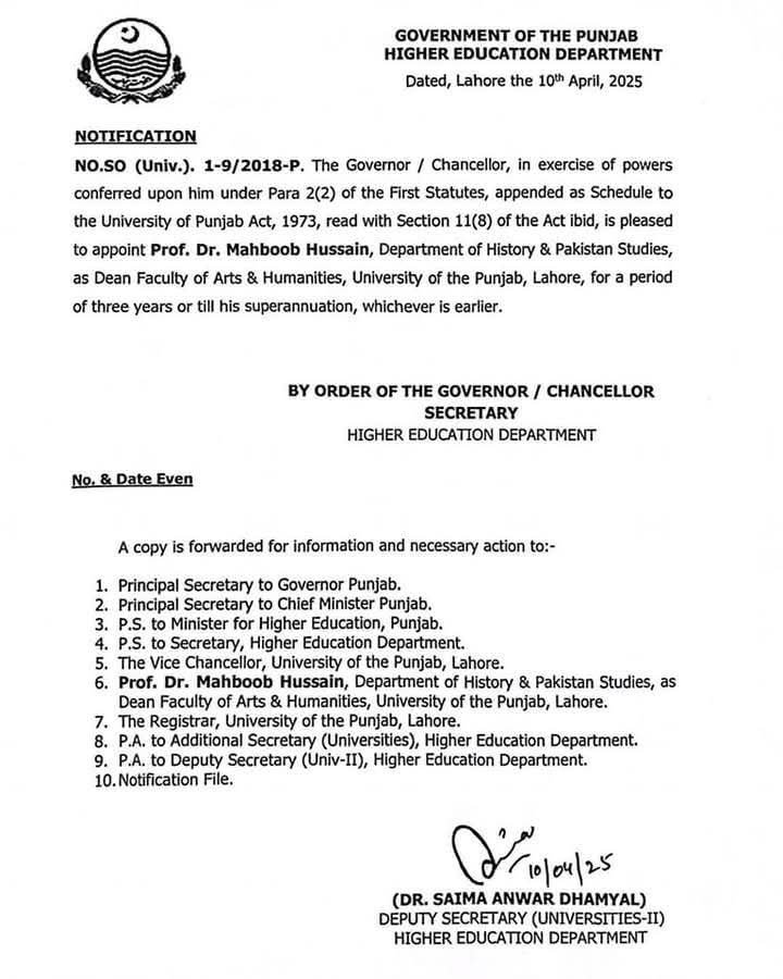 لاہور (خبر نگار )پنجاب یونیورسٹی ڈیپارٹمنٹ آف ہسٹری اور پاکستان سٹڈیز کے چیرمین پروفیسر ڈاکٹر محبوب حسین کو گورنر پنجاب نے ڈین فیکلٹی آف آرٹس اینڈ ہیومینٹییز تعینات کیا ہے گورنر پنجاب کی منظوری کے بعد محکمہ ہائر ایجوکیشن ڈیپارٹمنٹ پنجاب کی ڈپٹی سیکرٹری صائمہ انور دھمیال نے نوٹیفکیشن جاری کیا ہے ڈاکٹر محبوب حسین پچھلے کئی برس سے بطور چیرمین ڈیپارٹمنٹ آف ہسٹری اینڈ پاکستان سٹڈیز کام کر رہے ہیں اپنی سروس کے شروع میں محکمہ ہائر ایجوکیشن ڈیپارٹمنٹ پنجاب میں بطور لیکچرر ہسٹری کام کر چکے ہیں اتحاد اساتذہ پاکستان نے ان کی تعیناتی پر مسرت کا اظہار کیا ہے اور انہیں مبارک باد پیش کی ہے