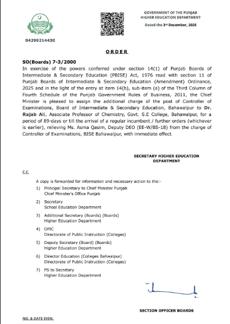 ڈاکٹر رجب علی گورنمنٹ ایس ای کالج بہاولپور میں شعبہ کیمسٹری کے استاد ہیں انہیں یہ ایڈیشنل چارج پہلے 89 دن کے لیے دیا گیا ہے جسے بعد میں توسیع دے دی جائے گی اتحاد اساتذہ پاکستان کی جانب سے ڈاکٹر رجب علی کو ڈھیروں مبارک اور دعا