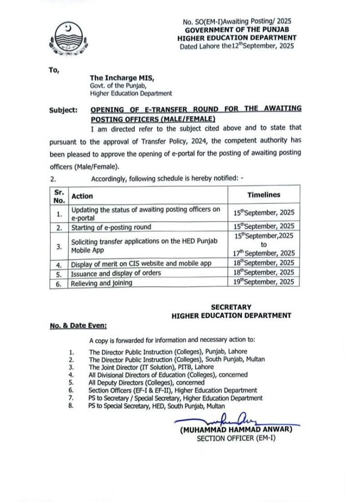 تین مراحل آج مکمل ہوگئے 1- پوسٹنگ کے منتظر مرد وخواتین اساتذہ کے سٹیٹس کی آپ ڈیٹنگ 2– ان لائن پوسٹنگ راؤنڈ کا آغاز 3–ایچ ای ڈی کی موبائل ایپ سے ٹرانسفر اپلیکیشنز کی وصولی کا 15 سے 17 ستمبر مکمل ہو گا