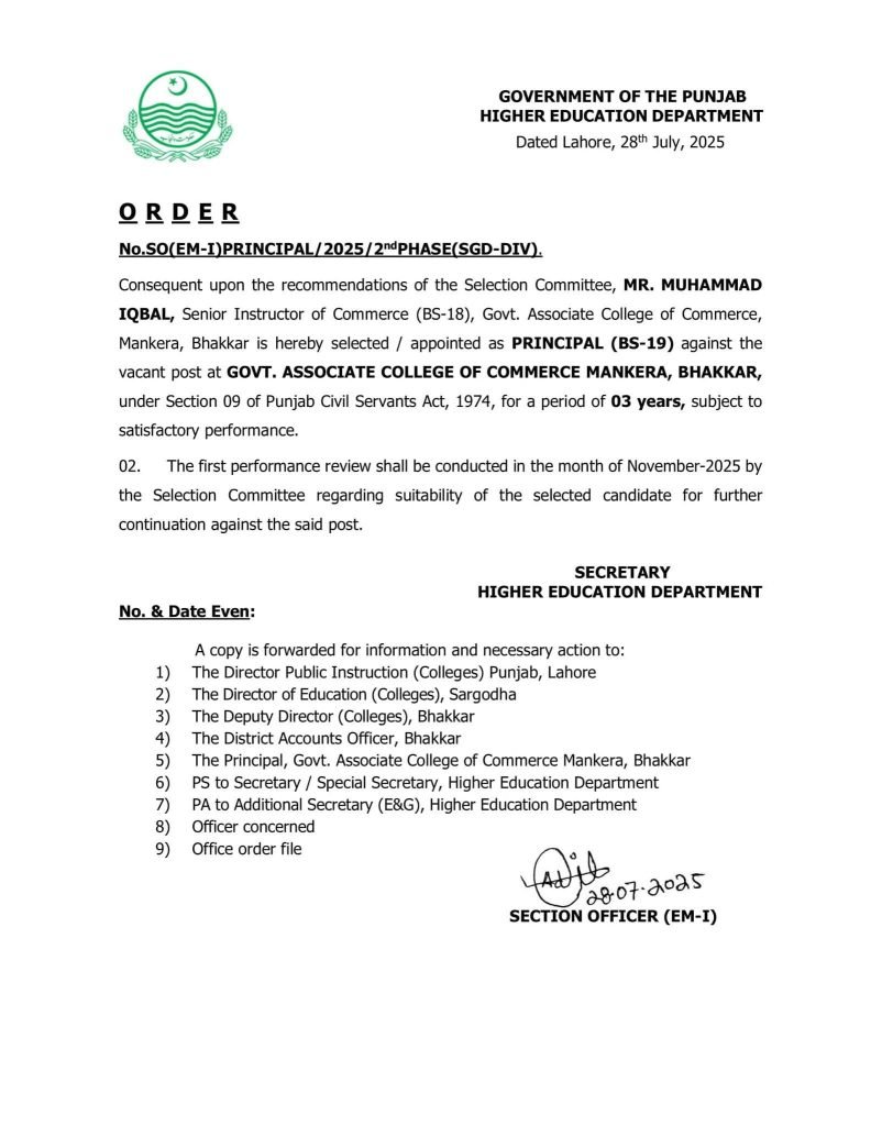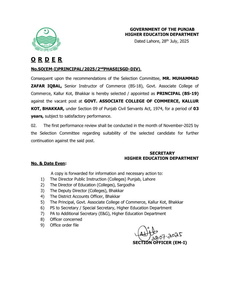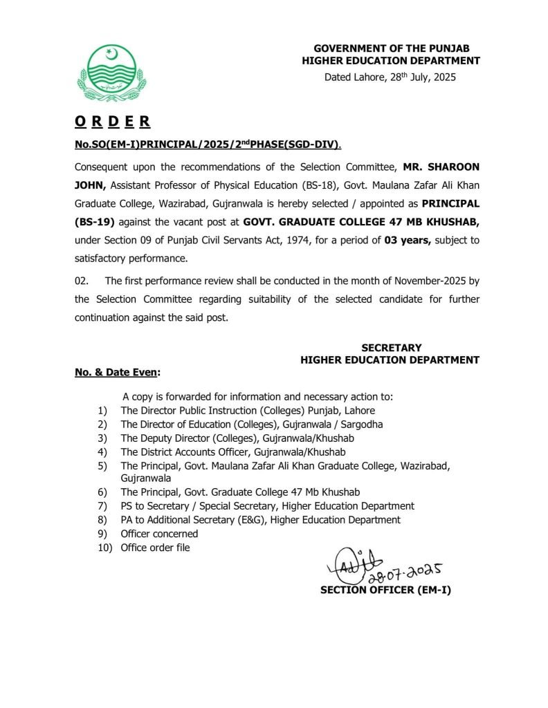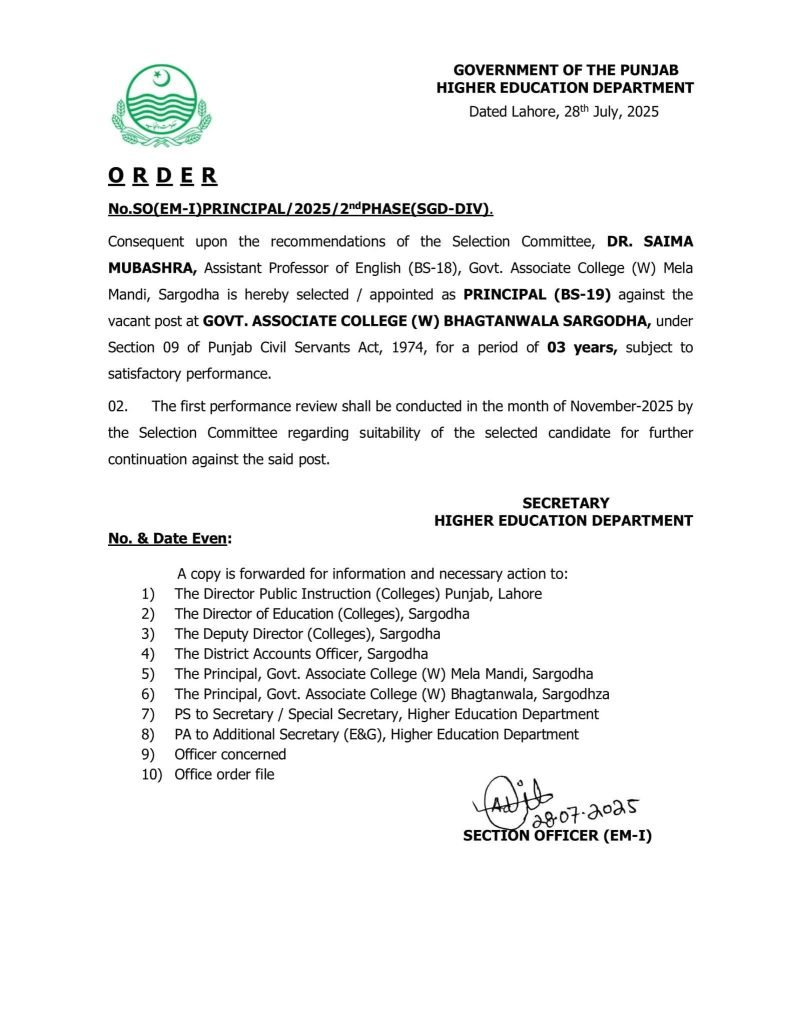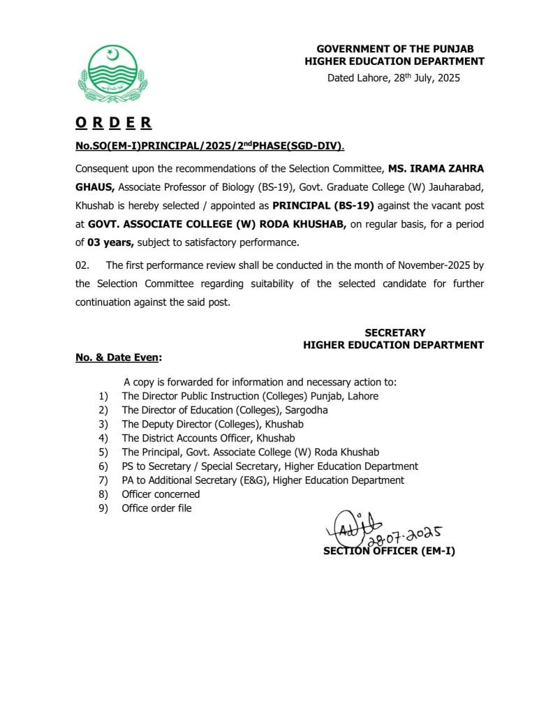 راولپنڈی ( نمائندہ خصوصی)کل مورخہ 28 جولائی 2025 بروز سوموارسرگودھا ڈویژن میں پرنسپلز کی خالی اسامیوں پر انٹرویوز ہوہے جن خواتین و حضرات کے انٹرویوز ہوئے ان میں کامیاب ہونے والوں کی میرٹ لسٹ تیار کی۔گئی نمبروں کے اعتبار سےمیرٹ پر اوپر آجانے والوں کے پوسٹنگ آرڈرز جاری کر دئیے گئے کامیاب ہوئے والوں اور پوسٹنگ آرڈرز پانے والوں کے خواتین وحضرات کے آرڈرز ذیل میں دئیے گئے ہیں
