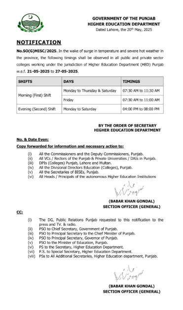 یہ اوقات کار 21 مئی سے 27 مئی تک کے لیے ہیں مارننگ شفٹ کا وقت ماسوائے جمعہ ساڑھے سات سے ساڑھے گیارہ جبکہ جمعہ کے روز ساڑھے سات سے گیارہ بجے تک پڑھائی ہوگی سیکنڈ شفٹ کا وقت چار بجے بعد دوپہر سے شام آٹھ بجے تک رکھا گیا ہے
