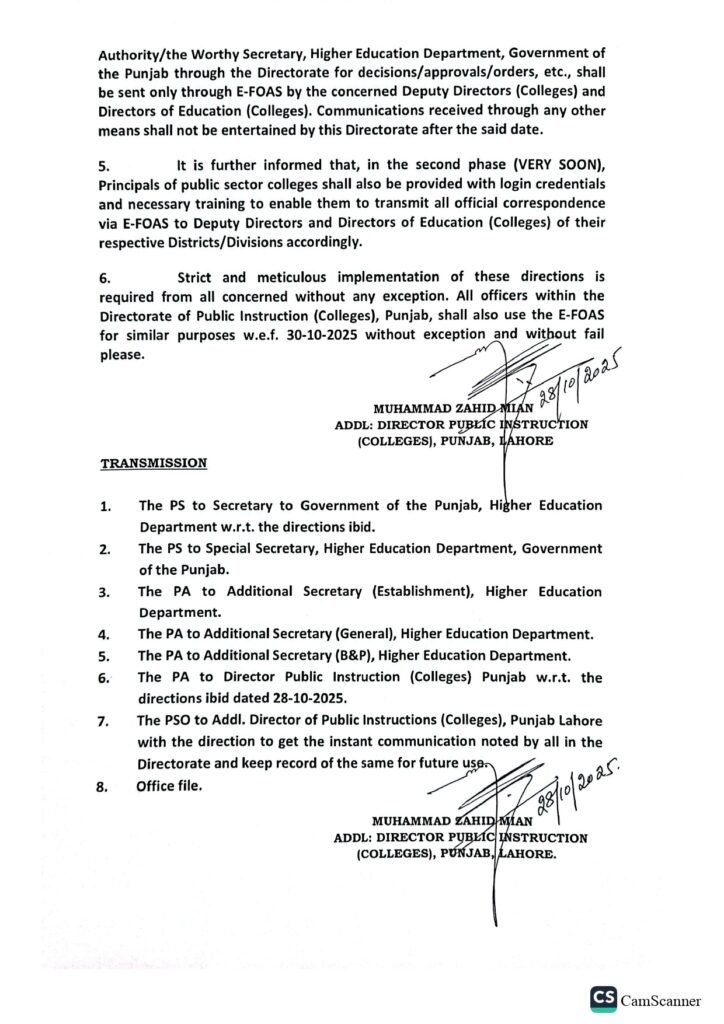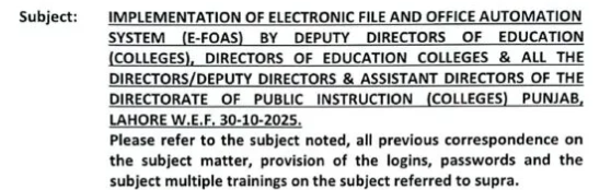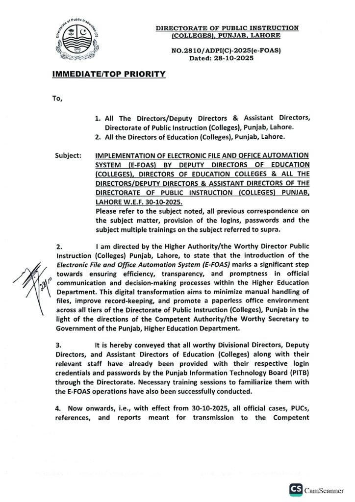 لاہور ( نمائندہ خصوصی) ڈائریکٹر پبلک انسٹرکشن پنجاب کے آفیس سے ایک خط ڈویژنل ڈائریکٹرز اور ڈپٹی ڈائریکٹرز کے نام جاری کیا گیا ہے جس کے مطابق کاغذوں اور پیپر فائلز کا کل آخری دن ہوگا پرسوں تیس اکتوبر 2025 سے پیپر لیس نظام اپنا کام شروع کر دے گا سسٹم جس کا نام ای- ایف او اے ایس کا نام دیا گیا ہے کے تحت دفاتر چلائے جائیں گے سارا دفتری عمل کمپوٹرائز اور خود کار ہوگا فایل اور کاغذات یکسر ختم کر کے یہ نیا سسٹم لایا جا رہا اس کے بارے میں کہا جا رہا ہے کہ کارکردگی بہتر ہوگی شفاف اور تیز رفتار ہو جائے گی تمام انتظامات مکمل کر لیے گئے ہیں ڈی پی آئی آفیس سمیت ڈویژنل ڈائریکٹرز ،ڈپٹی ڈائریکٹرز اور ان سے منسلک عملے کو تمام متعلقہ لاگ ان اور پاس ورڈ مہیا کر دئیے گئے ہیں