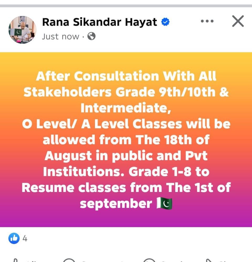 نویں، دسویں ۔انٹر میڈیٹ ،اے اور او لیول کی کلاسز 18 اگست سے شروع ہو جائیں گی جبکہ پہلی سے آٹھویں کے لیے سکول یکم ستمبر کو کھلیں گے