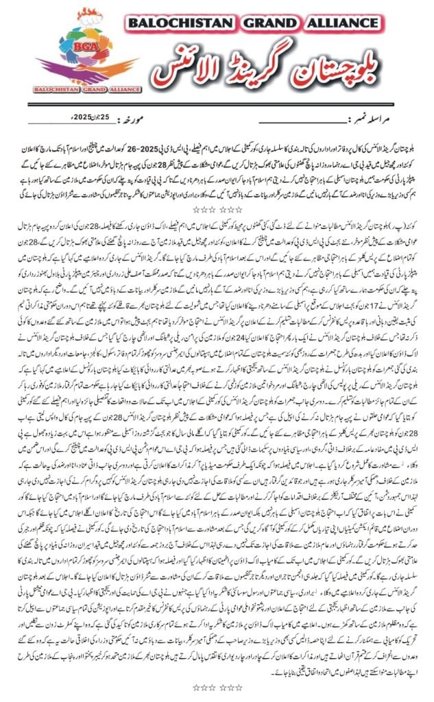 کویٹہ ( نمائندہ خصوصی ) صوبہ بلوچستان میں سرکاری ملازمین کی تنظیم بلوچستان گرینڈ الائنس نے ڈی آر اے نہ دینے پر احتجاج کیا ۔اور اسمبلی کا گیھراو کیا تو دو وزراء نے الائنس کے رہنماؤں سے ملاقات کر کے انہیں یقین دلایا کہ 30 فیصد دسپیرٹی ریڈکشن الاؤنس سمیت آپ کے تمام مطالبات تسلیم کرتے ہیں مظاہرین جب واپس چلے گئے تو بجٹ میں پانچ فیصد دسپیرٹی ریڈکشن الاؤنس کا اعلان کر دیا دوبارہ ملازمین نے اکھٹے ہو کراس دھوکہ دہی کے خلاف صدائے احتجاج بلند کی تو ان پر آنسو گیس کے شیل پھینکے گئے لاٹھی چارج کیا اور سترہ ملازمین کو گرفتار کر کے مچھ جیل میں بند کر دیا گیا جیل سے باہر کور کمیٹی نے اجلاس کر کے فیصلہ کیا ہے کہ تحریک جاری رہے گی دفاتر کی تالہ بندی کر دی گئی ہے وکلا نے ان کی حمایت میں عدالتوں کا بائیکاٹ کیا جیل کے اندر بند رہنماؤں نے آج جمعہ سے پانچ گھنٹوں کی علامتی بھوک ہڑتال کر دی ہے شہر میں تاجر تنظیموں سے رابطہ کر کے شیٹر ڈاؤن ہڑتال کی اپیل کی گئی ہے بلوچستان گرینڈ الائنس نے یہ بھی کہا ہے کہا ہے کہ اگر یہاں احتجاج نہ کرنے دیا گیا تو اسلام آباد کا رخ کریں گے اور ایوان صدر کے باہر احتجاج ہوگا