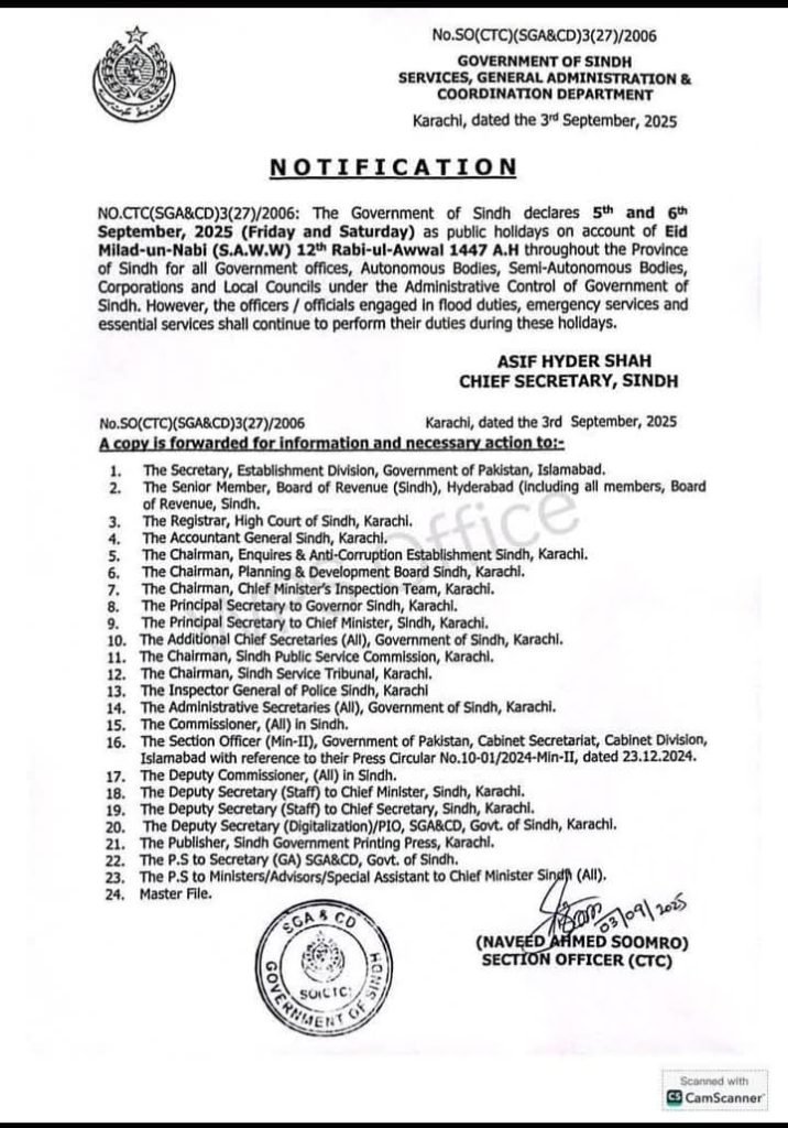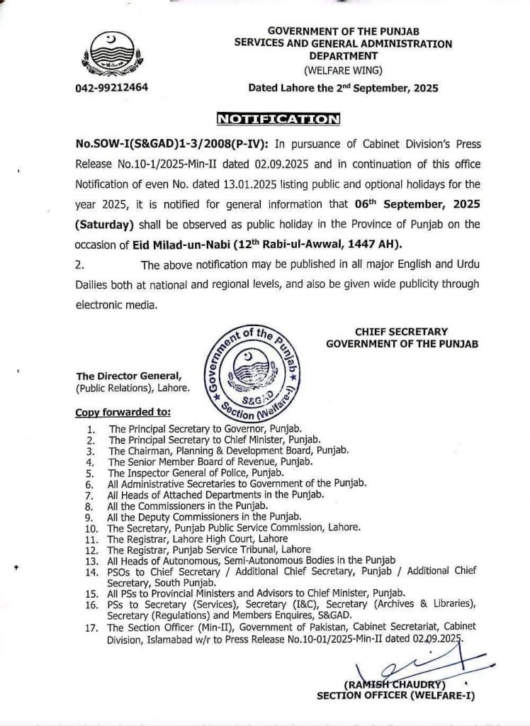 لاہور ( خبر نگار) محکمہ سروسز اینڈ جنرل ایڈمنسٹریشن پنجاب کے نوٹیفکیشن کے مطابق چھ ستمبر 2025 بروز ہفتہ بسلسلہ عید میلاد النبی صلی اللہ علیہ وآلہ وسلم کے موقع پر پنجاب میں عام تعطیل ہوگی تمام سرکاری نیم سرکاری اور خود مختار ادارے اس دن بند رہیں گے پنجاب کی کابینہ کے اجلاس منعقدہ دو ستمبر 2025 کو اس کی باقاعدہ منظوری دی گئی یہ چھٹی 2025 کے آغاز میں جاری تعطیلات کی فہرست میں پہلے ہی نوٹیفائی کی جا چکی تھی صوبہ سندھ کے محکمہ سروسز اینڈ جنرل ایڈمنسٹریشن کے نوٹیفکیشن کے مطابق اس موقع پر دو تعطیلات جمعہ 5 ستمبر اور ہفتہ 6 ستمبر 2025 کا اعلان کیا گیا ہے ان ایام کو صوبہ بھر کے تمام سرکاری ،نیم سرکاری اور خود مختار ادارے بند رہیں گے ان نوٹیفکیشنز کو تمام ذرائع ابلاغ کو اشاعت کے لیے بھیج دیا گیا ہے