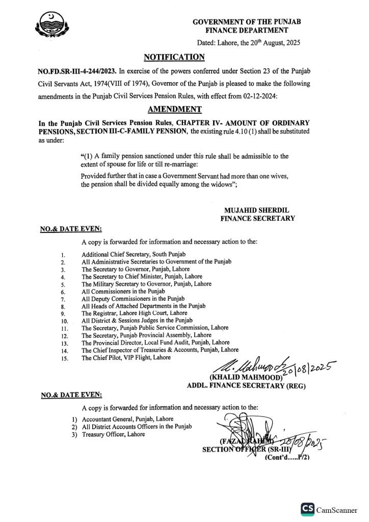 لاہور (نمائندہ خصوصی) سرکاری ملازمین کی موت کے بعد شریک حیات(بیوہ یا رنڈوا) کو تاحیات پنشن دی جائے گی یاد رہے کہ گزشتہ ترامیم کے مطابق سرکاری ملازم کی وفات کے بعد اس کی /کے شریک حیات کو پینشن کی مدت کو دس سال تک محدود کر دیا گیا تھا اس پر سرکاری ملازمین کی پیشہ وارانہ تنظیموں ،سیاسی و سماجی تنظیموں نے اس پر سخت رد عمل کا اظہار کیا احتجاج بھی کیے گئے جس کے بعد حکومت نے اپنا فیصلہ واپس لے لیا اور آج اس فیصلے کا محکمہ خزانہ حکومت پنجاب نے باقاعدہ نوٹیفکیشن جاری کر دیا ہے