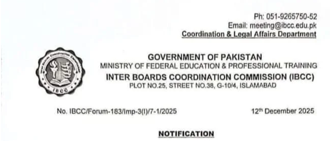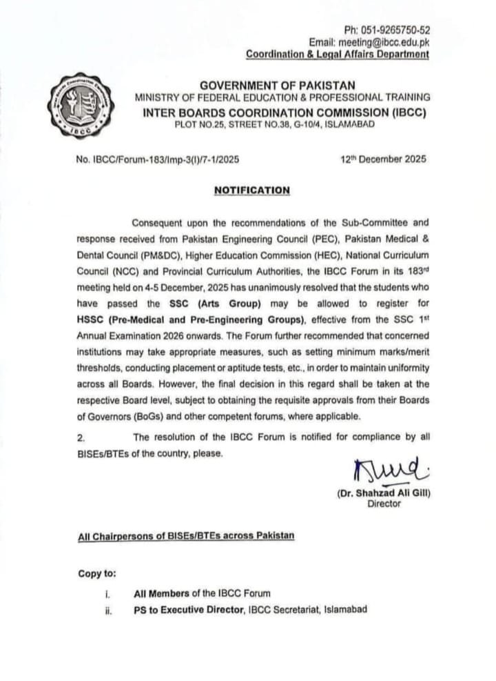 یہ فیصلہ انٹر بورڈ کمیٹی آف چیرمین کے 183ویں اجلاس میں جو چار اور پانچ دسمبر 2025 کو منعقد ہوا میں کیا گیا اس کو ایحنڈے میں لانے سے اس ضمن میں پاکستان انجینئرنگ کونسل ،پاکستان میڈیکل اینڈ ڈینٹل کونسل اور ہائر ایجوکیشن کمیشن سے مشاورت کی گئی ان سب کا جواب مثبت میں آنے پر انٹر بورڈ کمیٹی آف چیرمین میں اس کی منظوری حاصل کی گئی اس فیصلے کا اطلاق سالانہ امتحان 2026 سے ہوگا باقی فیصلے داخلے دینے والے اداروں پر چھوڑ دیے گئے کہ وہ داخل کی اہلیت کا کیا معیار طے کرتے ہیں