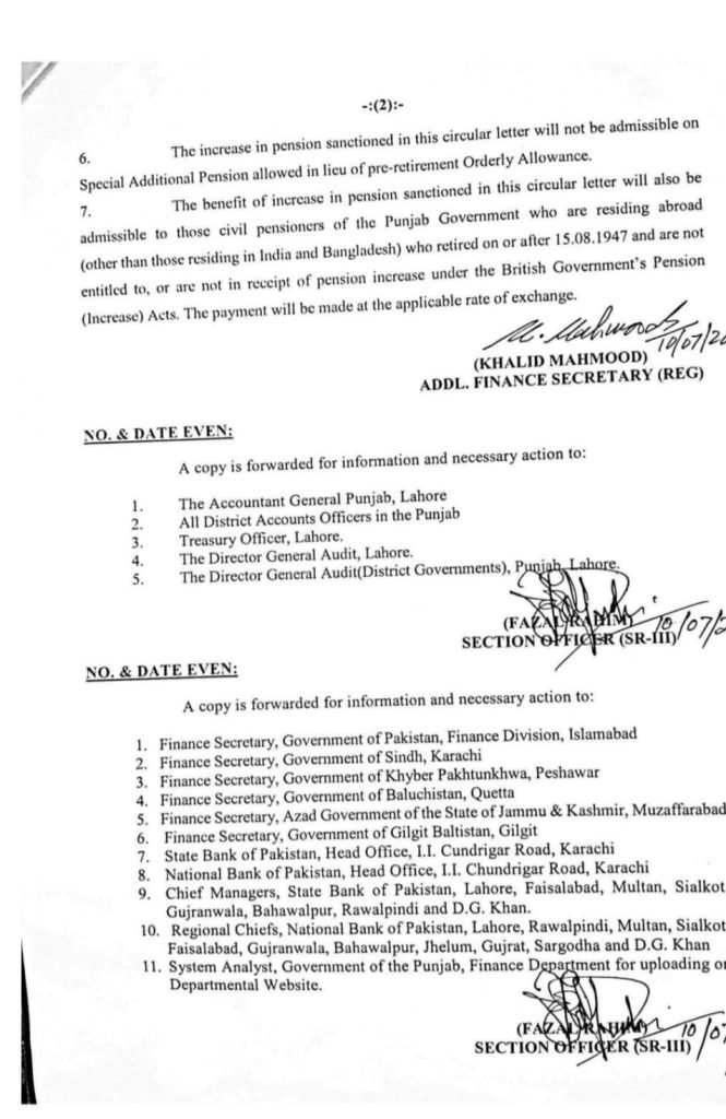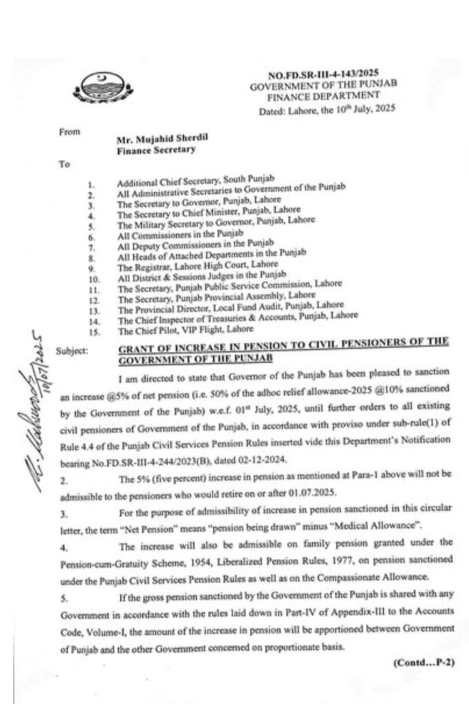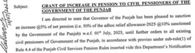 دو دسمبر دو ہزار چوبیس کو جاری ہونے والے فنانس ڈیپارٹمنٹ کے لیٹر کے حوالے سے کہا گیا ہے کہ اس لیٹر کے حوالے سے پینشنرز کو ملازمین کو ملنے والے ایڈہاک ریلیف الاؤنس کا پچاس فیصد ملنا تھا جب انہیں دس فیصد ملا تو ان کے حصے پانچ فیصد ایا