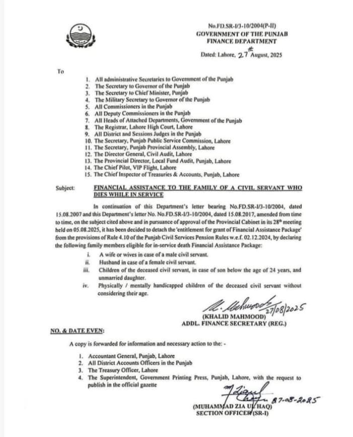 پہلے دو دسمبر 2024 کے نوٹیفکیشن میں سوائے شریک حیات کی دس سال فیملی پینشن کے سب کو پیشن کے حق سے محروم کر دیا گیا ہے اب چند روز قبل اس میں تبدیلی کرکے بیوہ کو تاحیات پیشن کو بحال کیا گیا اب اس نوٹیفکیشن میں بعض شرائط کے ساتھ بچوں کو بھی اس لسٹ میں شامل کر دیا گیا ہے