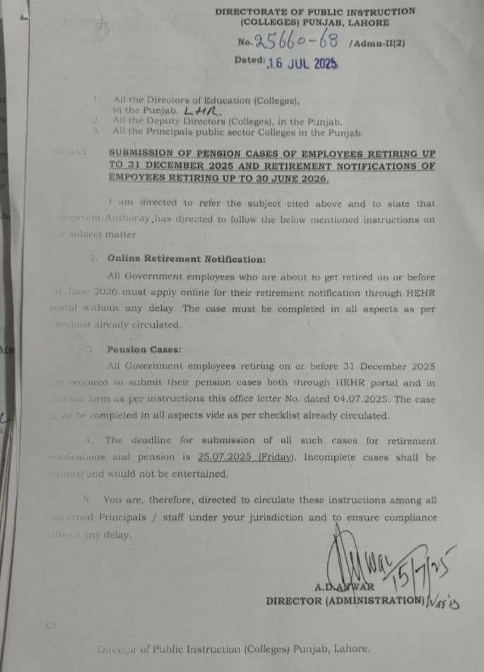 کیونکہ ریٹائرمنٹ نوٹیفکیشن کے لیے درخواستیں /پیشن پیپرز ان لائن جمع کروانا ہیں لہذا اکتیس دسمبر 2025 تک ریٹائر ہونے والے خواتین وحضرات پینشن پیپرز اور تیس جون 2026 تک ریٹائر ہونے والے تمام خواتین وحضرات اپنی درخواستیں برائے ریٹائرمنٹ نوٹیفکیشن 25 جولائی 2025 تک جمع کروا دیں
