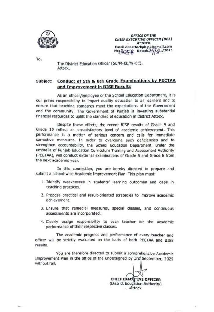 لاہور ( خبر نگار) پنجاب ایجوکیشنل ،ٹریننگ اینڈ ایسیسمنٹ اتھارٹی ,پیکٹا اس سال سے پانچویں اور آٹھویں کا امتحان لے گا اس کا مقصد نہم کے امتحان کے برے نتائج آنے کے بعد یہ فیصلہ کیا گیا ہے وزیر تعلیم نے سب سے پہلے تو اساتذہ کو نویں کے برے نتائج کا ذمہ دار قرار دے دیا اس پر کوئی انکوئری کمیٹی تشکیل نہیں دی ہو سکے ہے کہ اس کے ذمے دار کئی اور فیکٹر نکل آئیں اور وہ ود ان کی وزارت محکمہ سکول ایجوکیشن یا کچھ اور۔۔۔۔۔؟ ایک خط جو چیف ایگزیکٹو آفیسر اٹک کی طرف سے ڈسٹرکٹ ایجوکیشن آفیسر اٹک کے نام لکھا گیا جس میں وزیر تعلیم پنجاب کے اس بیان سے مطابقت صاف نظر آ رہی ہے جو کلاس نہم کے کمزور رزلٹ آنے پر میڈیا کے ذریعے جاری ہوا اور اس کا سارا الزام اساتذہ پر عائد کر دیا گیا چیف ایگزیکٹو آفیسر نے ڈسٹرکٹ ایجوکیشن آفیسر سے مخاطب ہوتے ہوئے کہا ہے کہ ہر سکول وائز امپرونمنٹ پلان نیایا جائے جس میں طلبا کے سیکھنے کی کمزوریوں اور پڑھانے کے طریق کار کے مابین فرق کو جانچا جائے اور تجویز کیا جائے کہ نتائج کو کیونکر بہتر بنایا جا سکتا ہے اس کے سدباب کے لیے مختلف تدبیر اپنائی جائیں ہر استاد کو تدریسی ڈیوٹی کو درست طرح سے اختیار کرنے کو یقینی بنانے کی زمہ داری دی جائے پیکٹا اور تعلیمی بورڈز کے نتائج کے لحاظ سے ہر استاد کی کارکردگی جانچیں
