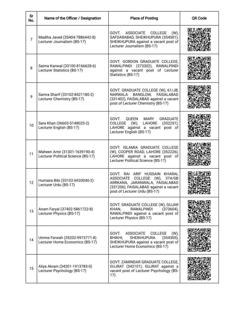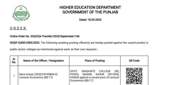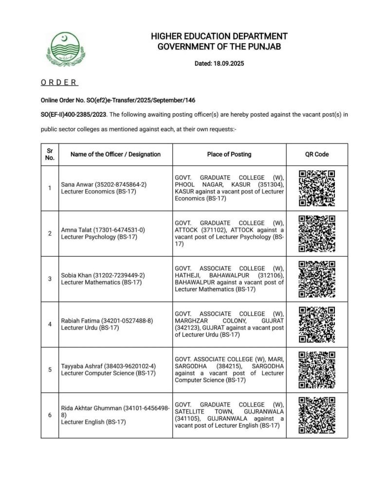 خواتین کے پوسٹنگ آرڈرز