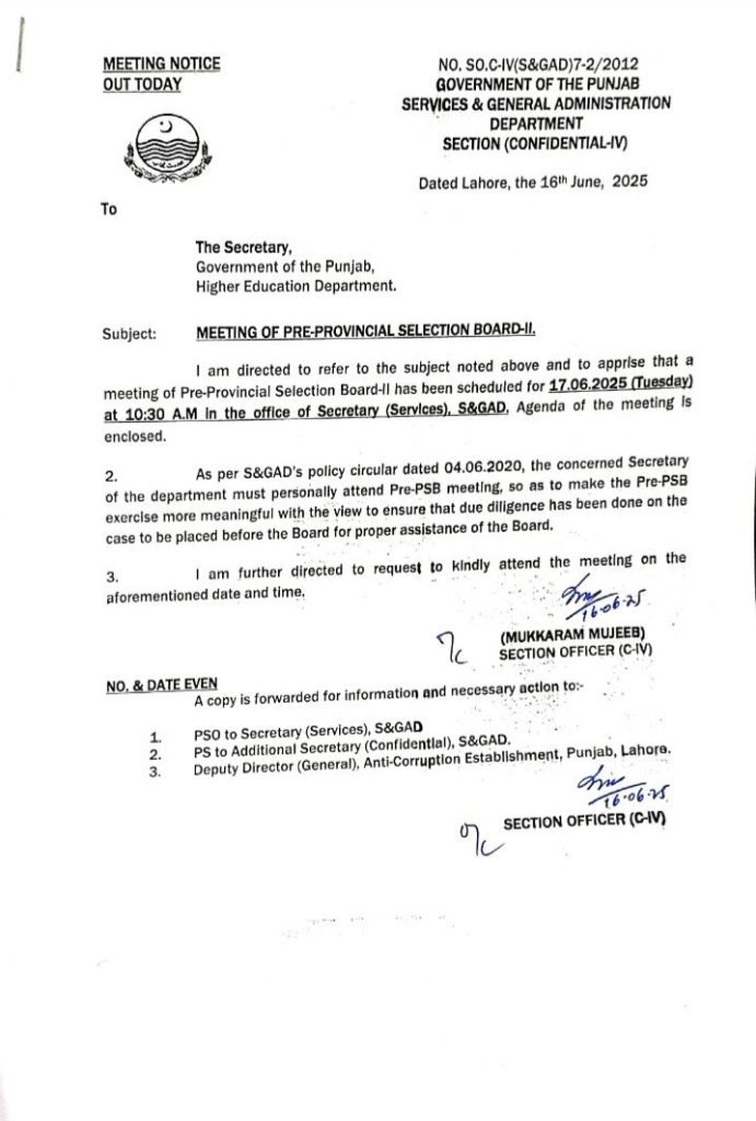 یہ پری ایس بی اجلاس 17 جون کو ساڑھے دس بجے سیکریٹری سروسز اینڈ جنرل ایڈمنسٹریشن کے دفتر میں منعقد ہوگا تمام متعلقہ سیکریٹریز کو دی جا چکی ہے
