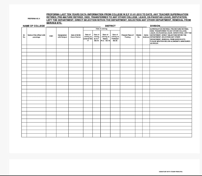 اس مقصد کے لیے ایک پرفارما دیا جا رہا ہے اس پر اس دوران مدت ملازمت مکمل کرکے ریٹائر ہونے والوں ،قبل از وقت ریٹائرمنٹ لینے والوں ،دوسرے کالجز میں ٹرانسفر ہونے والوں ،ڈیپوٹیشن پر جانے والوں ،بیرون ملک چھٹی والوں ،جو ڈیپارٹمنٹ چھوڑ کے چلے گئے ،ڈائریکٹ سلیکشن کے بعد اپنے ہی ڈیپارٹمنٹ میں ایڈجسٹ ہونے والوں اور سلیکشن کے بعد کہیں جانے والوں اور سروس سے نکالے جانے والوں کے کوائف دئیے گئے پرفارما پر درج کرکے بھجوائیں