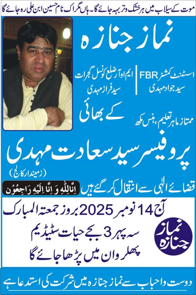 سید سعادت مہدی سابق ڈائریکٹر ایڈمن سید خضر مہدی کے بھتیجے تھے مرحوم کی عمر تقریبا باون برس تھی اور وہ گورنمنٹ زمیندارہ کالج گجرات کے شعبہ انگریزی سے وابستہ تھے کل شام ہارٹ اٹیک ہوا جو اتنا شدید تھا کہ طبی امداد کے لیے ہسپتال بھی نہ پہنچ پائے اور راستے میں ہی اللہ کے پاس پہنچ گئے