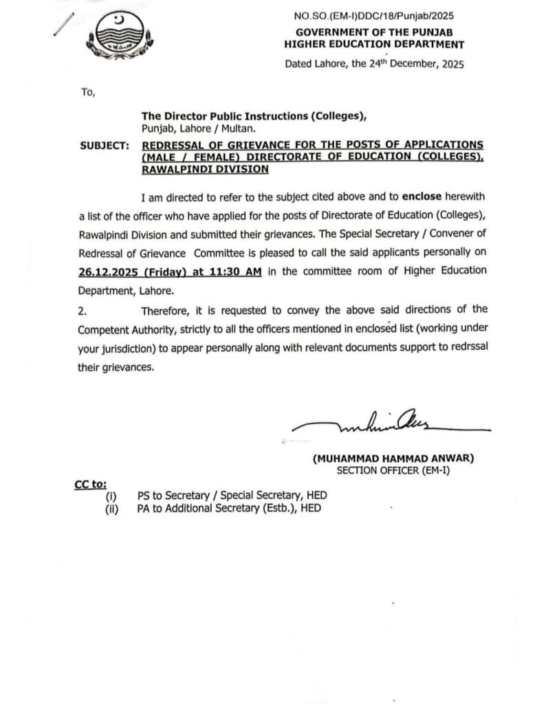 لاہور ( خبر نگار) ڈائریکٹر پبلک انسٹرکشن کالجز پنجاب نے تمام ڈویژنل ڈائریکٹرز کو لکھا ہے کہ ڈائریکٹر راولپنڈی کی پوسٹ کے لیے جن امیدواران نے درخواست دے رکھی ہے اور انہیں ڈیپارٹمنٹ نے ان کے میرٹ کے ابتک بننے والے نمبرز بارے معلومات ان کو فراہم کر دی ہیں انہیں ان پر اگر کوئی شکایت ہے تو اس کے ازالے کیلئے ایک میٹنگ زیر صدارت سپیشل سیکرٹری ہائر ایجوکیشن ڈیپارٹمنٹ پنجاب 26 دسمبر 2025 کو ہائر ایجوکیشن کے دفتر واقع نئی انارکلی لاہور میں صبح ساڑھے گیارہ بجے رکھی گئی ہے وہاں تشریف لائیں چھ امیدواران کی لسٹ بھی فراہم کی گئی ہے اور ڈویژنل ڈائریکٹرز سے کہا گیا ہے کہ ان میں سے جو بھی آپ کے زیر انتظام ڈویژن میں کام کر رہا ہے انہیں وہاں بھجوانے کا بندوست کریں