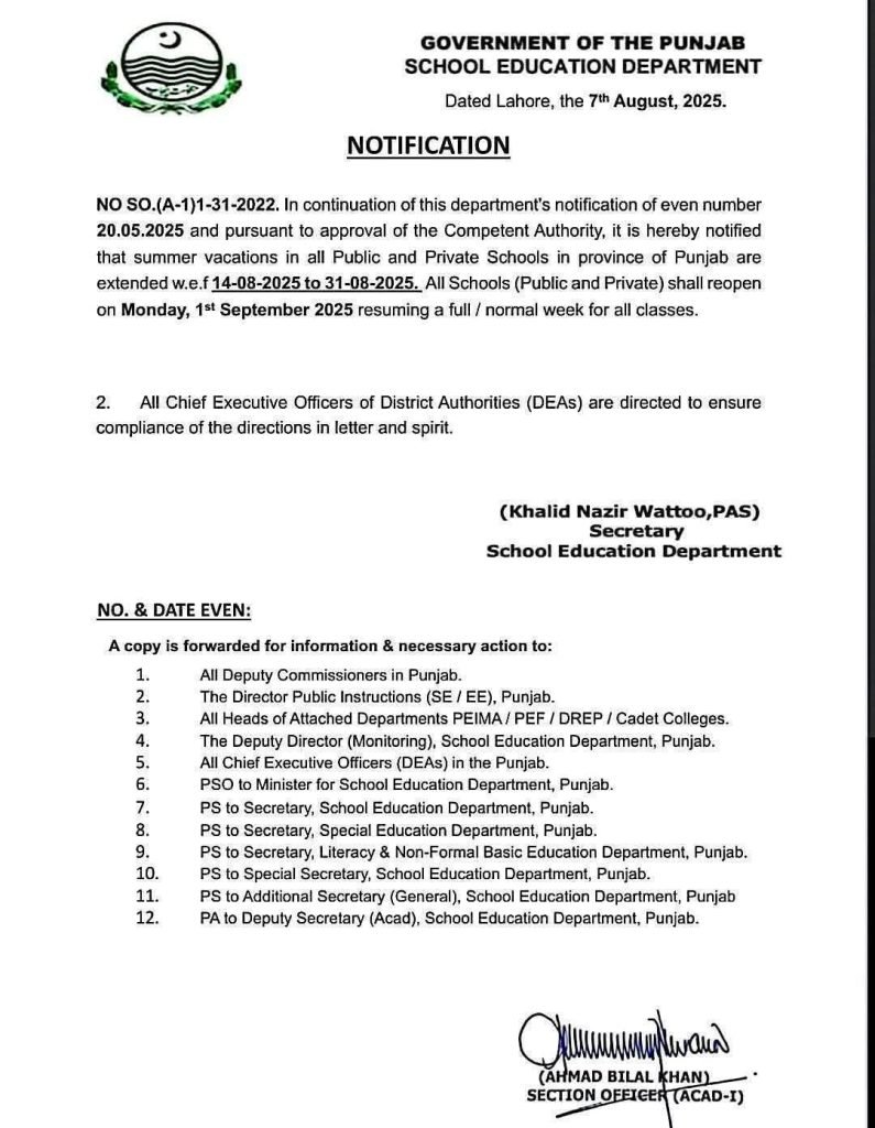 پنجاب کے سکولز اب چودہ اگست کی۔بجائے یکم ستمبر کو کھولنے گے کئی روز سے ایسا کیے جانے کی افواہ تھی سوشل میڈیا پر خبر کی پہلے تردید کی پھر اچانک نوٹیفکیشن جاری کر دیا