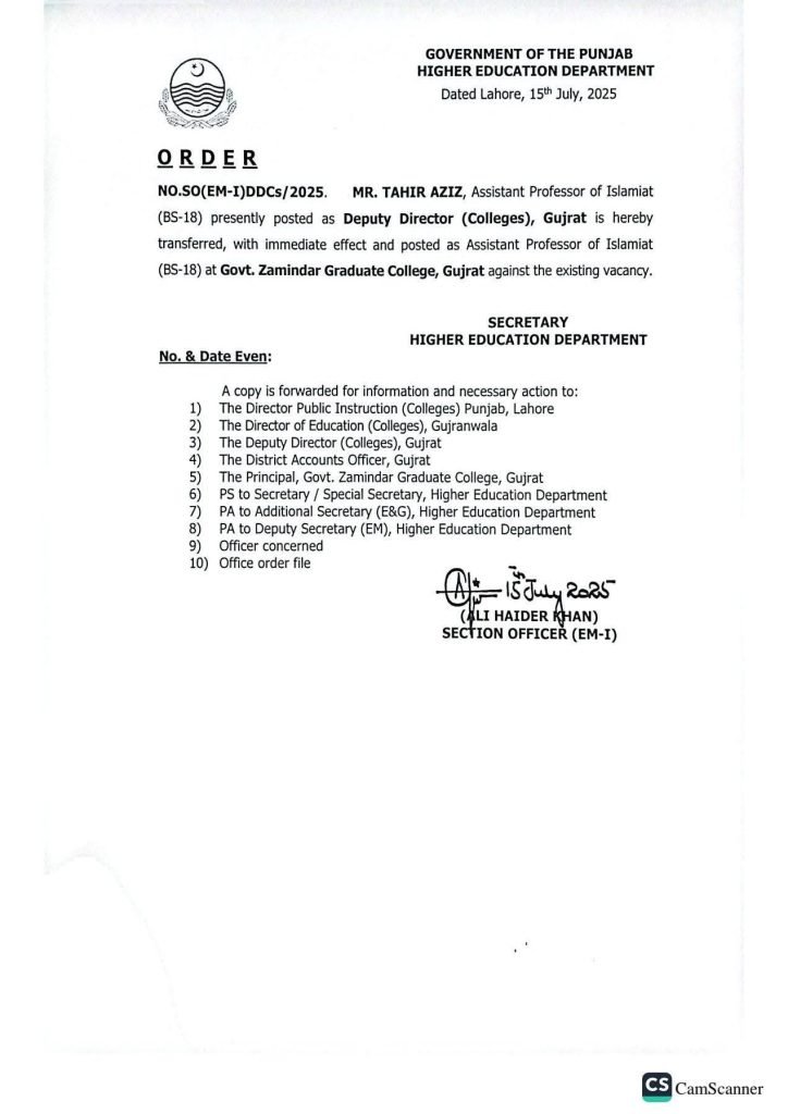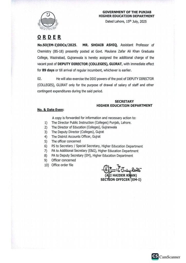 گجرات ( نمائندہ خصوصی ) گورنمنٹ گریجویٹ کالج وزیر آباد کے کیمسٹری کے اسسٹنٹ پروفیسر شعیب عاشق بٹ کو دپٹی ڈائریکٹر کالجز گجرات کا اضافی چارج دیا گیا ہے ڈپٹی ڈائریکٹر کالجز گجرات پروفیسر طاہر عزیز کو گورنمنٹ زمیندارہ گریجویٹ کالج گجرات میں اسسٹنٹ پروفیسر کی ایک خالی آسامی پر پوسٹ کر دیا گیا ہے پروفیسر شعیب عاشق بٹ ایک تجربہ کار آفیسر ہیں اور اس سے قبل وہ ڈپٹی ڈائریکٹر گجرات اور ڈپٹی ڈائریکٹر گوجرانولہ خدمات سر انجام دے چکے ہیں ان کی بطور ڈپٹی ڈائریکٹر گجرات تعیناتی سے گوجرانولہ اور گجرات کے تعلیمی حلقوں میں خوشی کی لہر دوڑ گئی ہے اتحاد اساتذہ پاکستان انہیں یہ قلمدان سنبھالنے پر مبارک باد پیش کرتی ہے