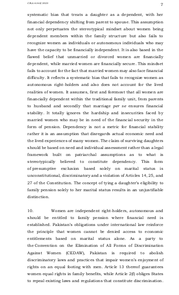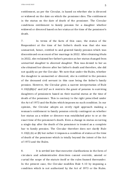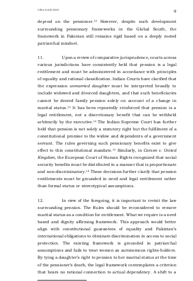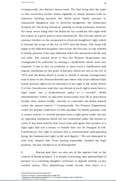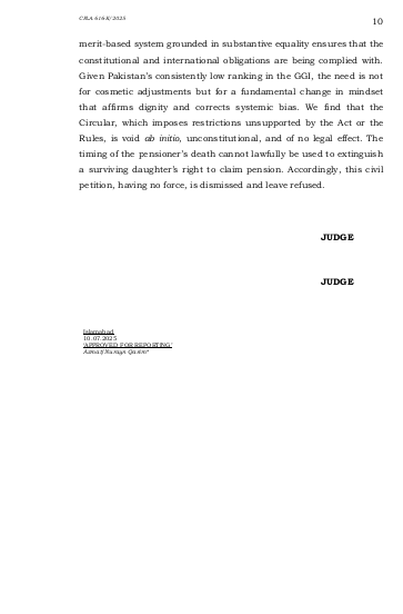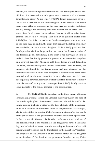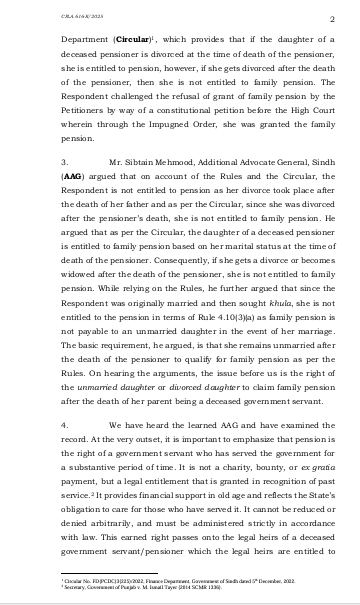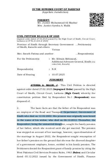 سندہ ہائی کورٹ کے لاڑکانہ بینچ نے سروتھ فاطمہ کیس میں درخواست دہندہ کے حق میں فیصلہ دیا تھا جس کے خلاف حکومت سندھ نے سپریم کورٹ میں اپیل دائر کی عدالت عظمیٰ نے سندھ ہائیکورٹ لاڑکانہ بینچ کے فیصلے کو دیکھا اور دونوں اطراف کے دلائل سننے کے بعد سندھ ہائی کورٹ کے فیصلے کو برقرار رکھا اور اپیل کو برخاست کر دیا سروتھ فاطمہ سندھ حکومت کے ایک سابق سرکاری ملازم کی بیٹی ہے جو اپنی زندگی میں پینشن لیتا رہا اس کے انتقال کے بعد بیوہ کو فیملی پیشن دی گئی اس کے انتقال پر سروتھ فاطمہ غیر شادی شدہ بیٹی کے طور پر پیشن لیتی رہی شادی ہو جانے پر فیملی پینشن کا سلسلہ منقطع ہوگیا مگر پھر اس نے طلاق لی بطور طلاق یافتہ بیٹی اس کی پیشن کے لیے درخواست کو رد کر دیا گیا اس نے کورٹ سے رجوع کیا
