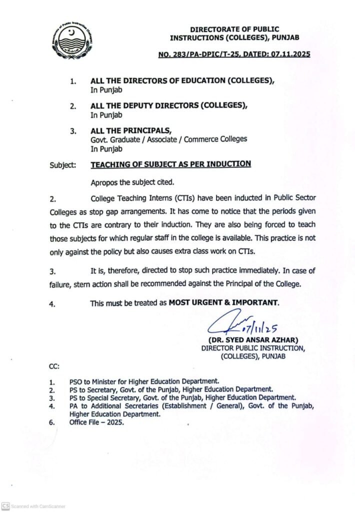 اعلی حکام کے علم میں یہ بات لائی گئی ہے کہ بعض کالجز میں آن سے زبردستی وہ پیریڈ پڑھوانے جا رہے ہیں جن کے اساتذہ موجود ہیں ایسے پرنسپلز کے خلاف سخت ایکشن لیا جائے گا