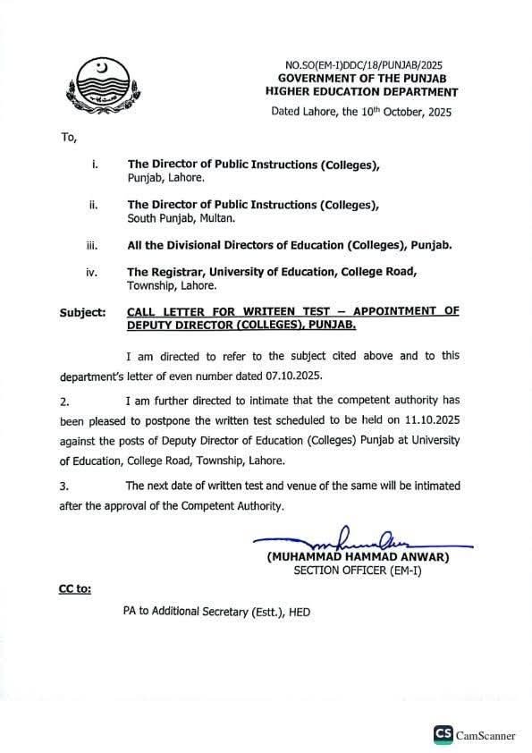 لاہور ( خبر نگار)شہر میں پیدا ہونے والی لا اینڈ آرڈر کی صورت حال کے پیش نظر ایجوکیشن یونیورسٹی ٹاؤن شپ لاہور میں گیارہ اکتوبر 2025 بروز ہفتہ کو ہونے والے ڈپٹی ڈائریکٹر کے تحریری امتحانات فی الحال ملتوی کر دئیے گئے ہیں تحریری امتحان کی اگلی تاریخ کا اعلان مجاز اتھارٹی کے منظوری کے بعد کیا جائے گا