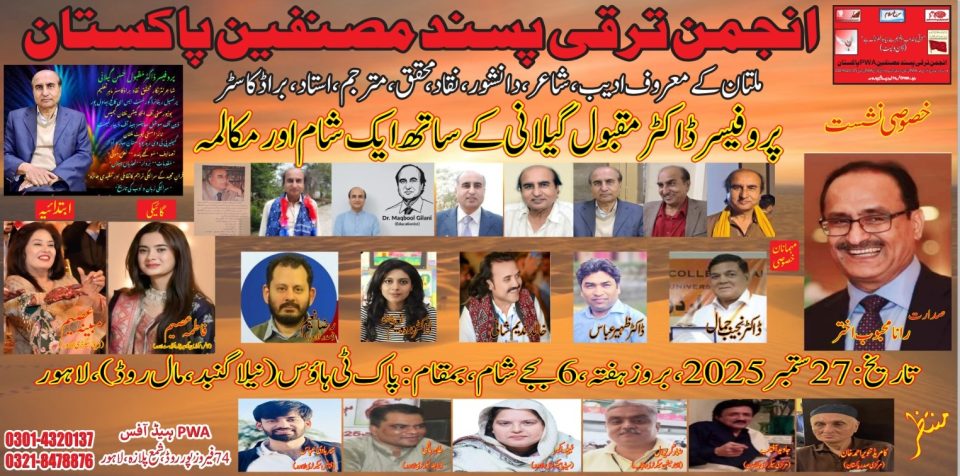 لاہور ( خصوصی رپورٹ) لاہور کے باسیوں نے27 ستمبر کی شام ملتان بلکہ جنوبی پنجاب کی معروف شخصیت پروفیسر مقبول حسین گیلانی کے ساتھ منائی انجمن ترقی پسند مصنفین نے اس تقریب کا اہتمام پاک ٹی ہاؤس میں کیا پروفیسر مقبول گیلانی سرائیکی و پنجابی کے معروف شاعر ،ادیب ،محقق ،دانشور ،مترجم ،براڈکاسٹر اور نامور استاد کے طور پر جانے پہچانے جاتے ہیں اس شب لاہور کے دوستوں کی محبتیں سمیٹنے ملتان سے لاہور تشریف لائے یہ خصوصی نشست مشہور دانشور رانا محبوب اختر کی زیر صدارت منعقد ہوئی پروفیسر رانا اسلم پرویز ،انجمن کے مرکزی صدر کامریڈ تنویر احمد خاں ،جاوید آفتاب اور صاحب صدر رانا محبوب اخترنے پروفیسر ڈاکٹر مقبول گیلانی کی شخصیت کے مختلف پہلوؤں پر بات کی معروف لکھاری الیاس کبیر کی پروفیسر مقبول گیلانی پرایک تحریر جو مقبول گیلانی کی شخصیت کے تقریباً سبھی پہلوؤں کا احاطہ کیے ہوئے تھی لاہور کی ایک پروفیسر خاتون نے پیش کی جسے ذیل میں آپ کی نظر کیا جا رہا ہے تقریب میں مہمان خصوصی جناب مقبول گیلانی اور بہت سے مرد وخواتین نے مشہور گیت ،نظمیں اور صوفیانہ کلام گاکر شرکا محفل کے دلوں کو گرمایا