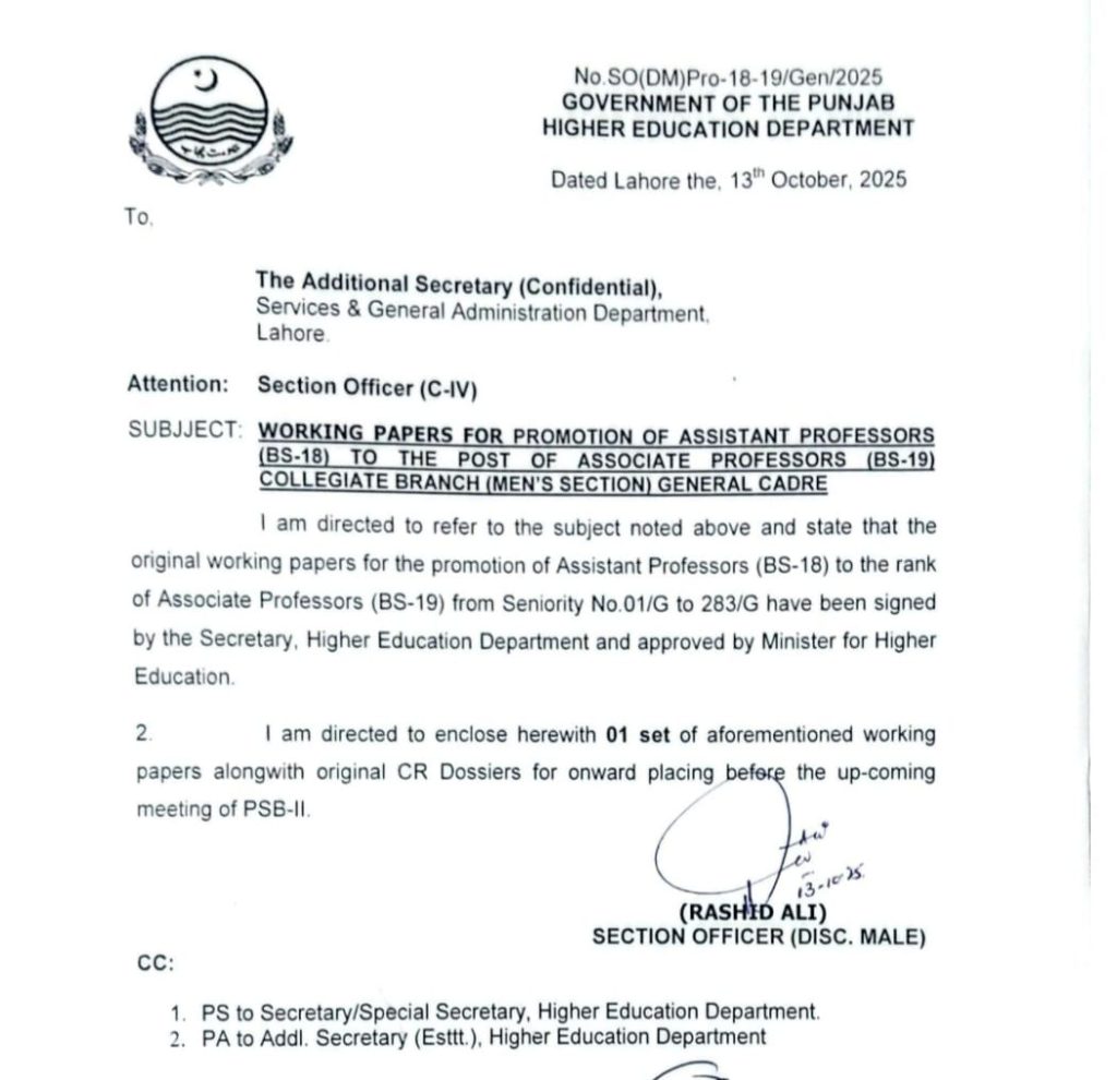 لاہور ،(خبر نگار) مرد اسسٹنٹ پروفیسر کے کیسز سنیارٹی نمبر 1 تا 283 برائے پرموشن گریڈ 19 تمام مراحل طے کرنے کے بعد اب ایڈیشنل سیکرٹری کنفیڈنشل ایس اینڈ جی اے ڈی کو روانہ کر دئیے گئے ہیں ایسوسی ایشن نے نمائندگان نے اس کی راہ میں حائل تمام رکاوٹیں دور کروا دی ہیں پہلے آنٹی کرپشن کا این او سی اور پھر منسٹر تعلیم کے دفتر کی رکاوٹ تھی سیکرٹری ایجوکیشن نے اب اسے پیش کرنے کی اجازت دیکر دستخط کر کے ایس اینڈ جی اے ڈی کے دفتر میں بھجیوا دئیے ہیں اور کوشش کر رہے ہیں کہ اسی ماہ یہ پی ایس بی ٹو میں پیش ہو جائیں