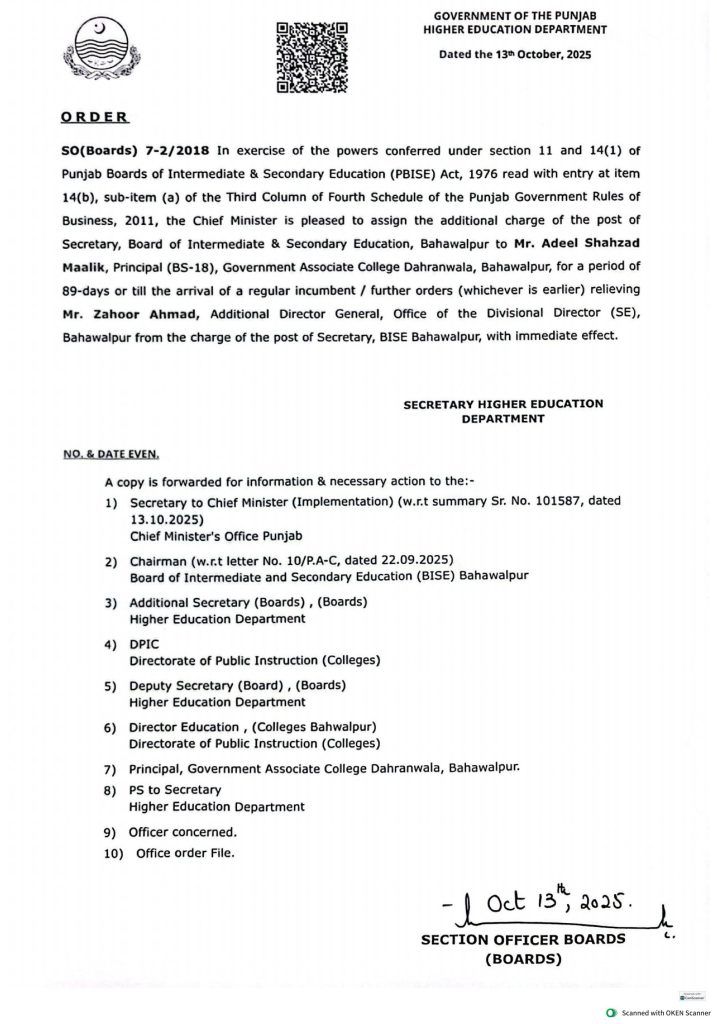 لاہور ( خبر نگار) گورنمنٹ ایسوسی ایٹ کالج ڈاہرانوالہ کے پرنسپل پروفیسر عدیل شہزاد مالک چیمہ کو بورڈ آف انٹرمیڈیٹ اینڈ سیکنڈری ایجوکیشن بہاولپور کے سیکرٹری کا چارج دے دیا گیا ہے یہ چارج انہیں 89 دن کے لیے دیا گیا ہے اس سے قبل ڈائریکٹوریٹ سکولز بہاولپور ڈویژن کے ایڈیشنل ڈائریکٹر جنرل ظہور احمد کے پاس اس عہدے کا چارج تھا ان کے چارج لینے سے وہ ریلیو ہو گئے ہیں حکومت کے اعلی حکام نے ان کو اس عہدے کا چارج ان کی اعلی انتظامی صلاحیتوں کا اعتراف کرتے ہوئے کیا ہے ان کی تقرری سے کالج اساتذہ میں خوشی کی لہر دوڑ گئی ہے اتحاد اساتذہ پاکستان کے ساتھیوں نے انہیں ڈھیروں مبارکباد پیش کی ہے ان کے لیے کامیابی کے لیے دعا کی ہےاور انہیں بھر پور تعاون کی یقین دہانی کروائی ہے