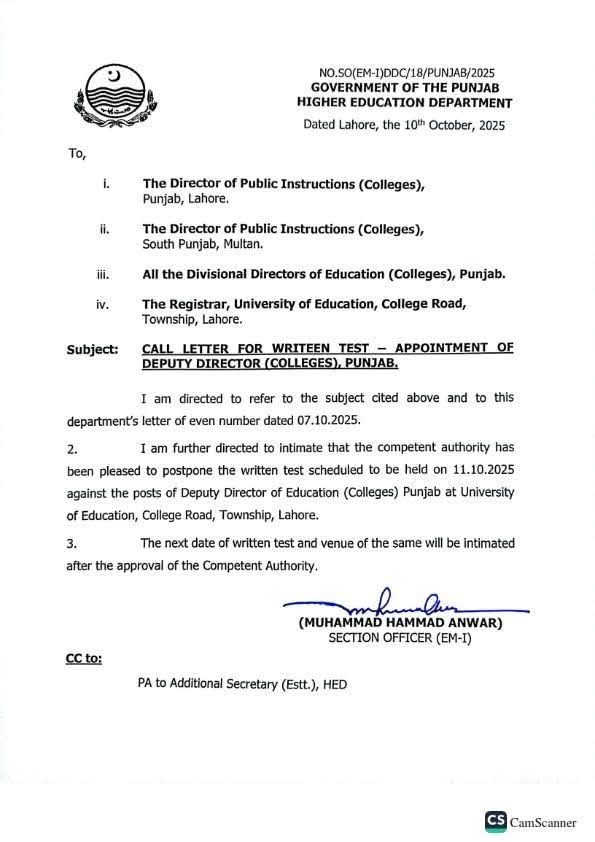 ڈپٹی ڈائریکٹرز کی پوسٹ کے لیے لاہور میں ہونے والا ٹیسٹ ملتوی